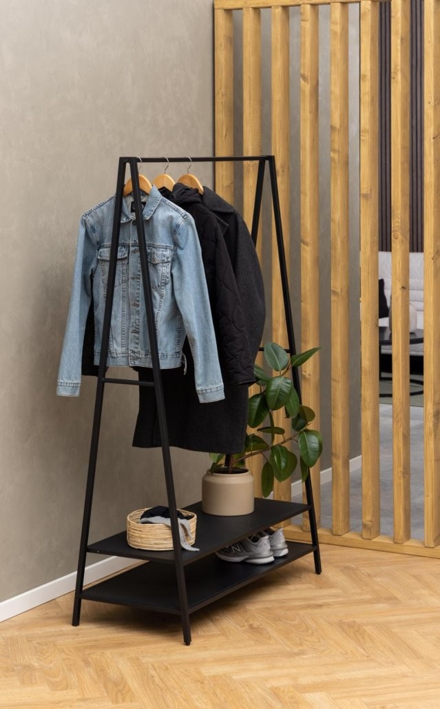 Obešalnik Darian ponuja veliko prostora za obešanje oblačil in prinaša minimalistično, moderno vzdušje v vašo predsobo. Izdelan je iz črnega kovinskega materiala, ki daje občutek sodobnosti. Ponaša se s stilskim izgledom in prinaša funkcionalnost v vaš hodnik – na spodnji polici lahko celo shranjujete obutev.