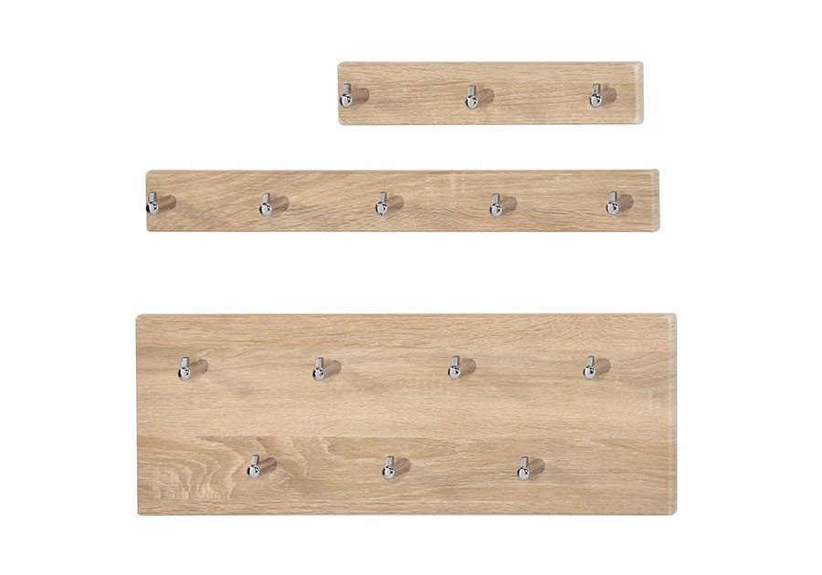 Obešalnik JAN 2 je stenski obešalnik iz mediapana s petimi kljukicami v sonoma hrast barvi - brušen. Kljukice so kromirane.