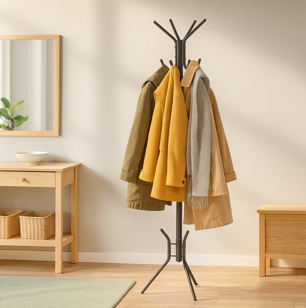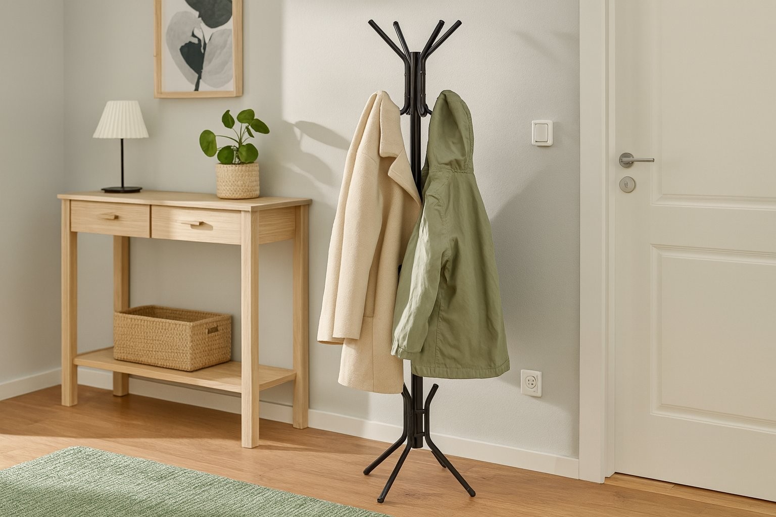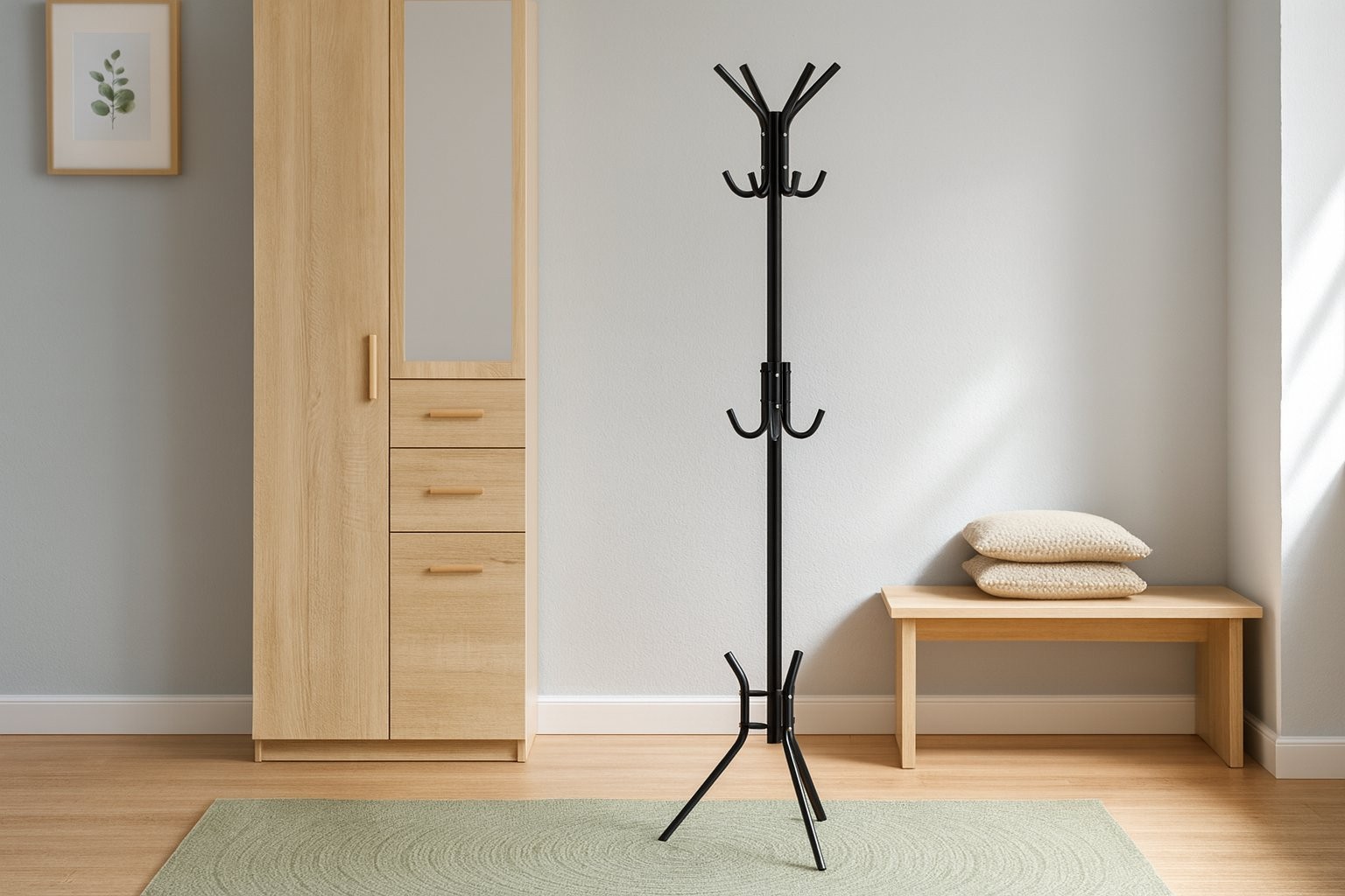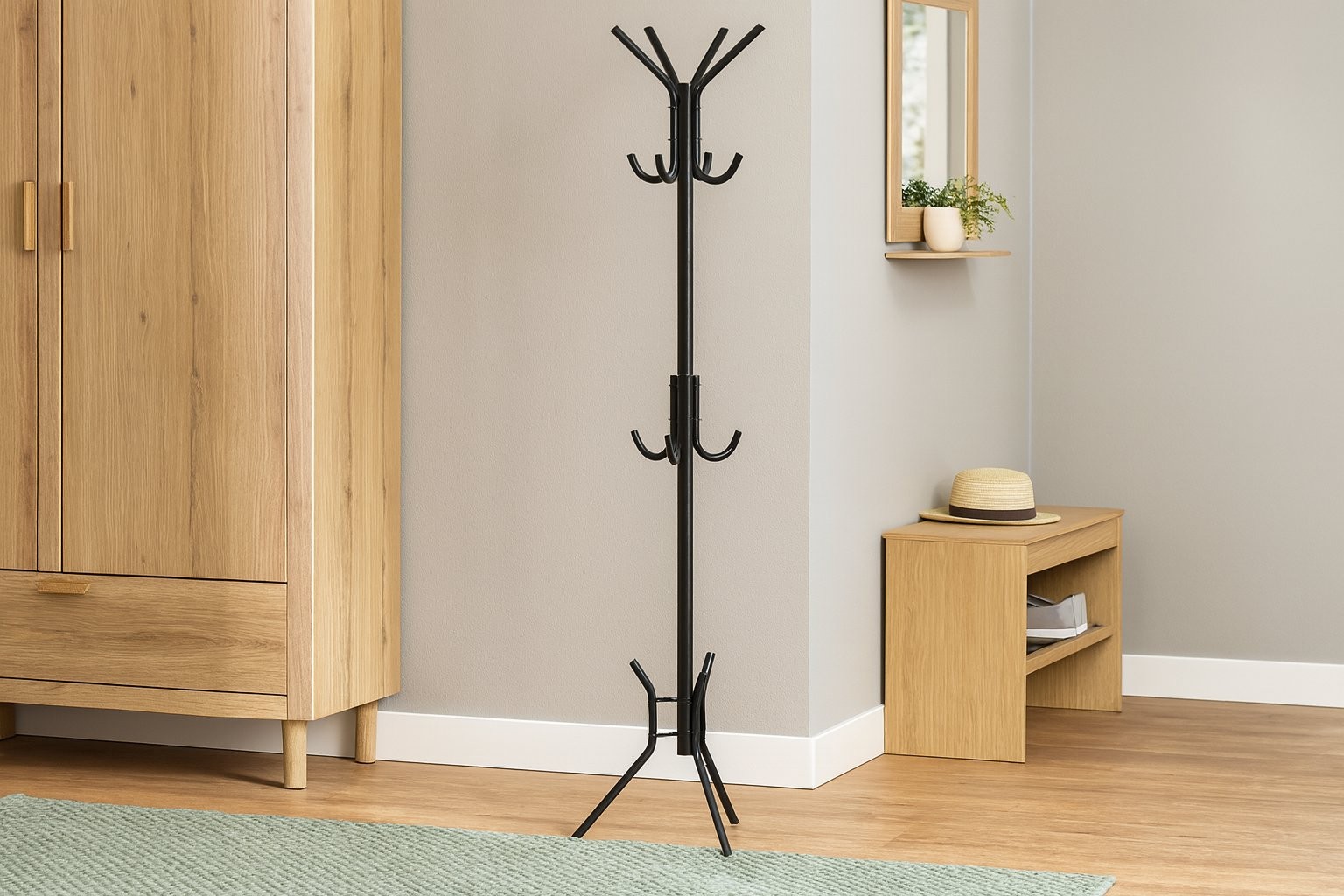 Obešalnik Šonen (črn) je funkcionalen kos pohištva oziroma dodatek za dom, ki združuje uporabnost in urejen videz. Barvna izvedba v odtenku črn se zlahka poveže z različnimi ambienti. Izbor materialov, kot so kovina, dopolnjuje uporabno in vizualno uravnoteženo zasnovo.
