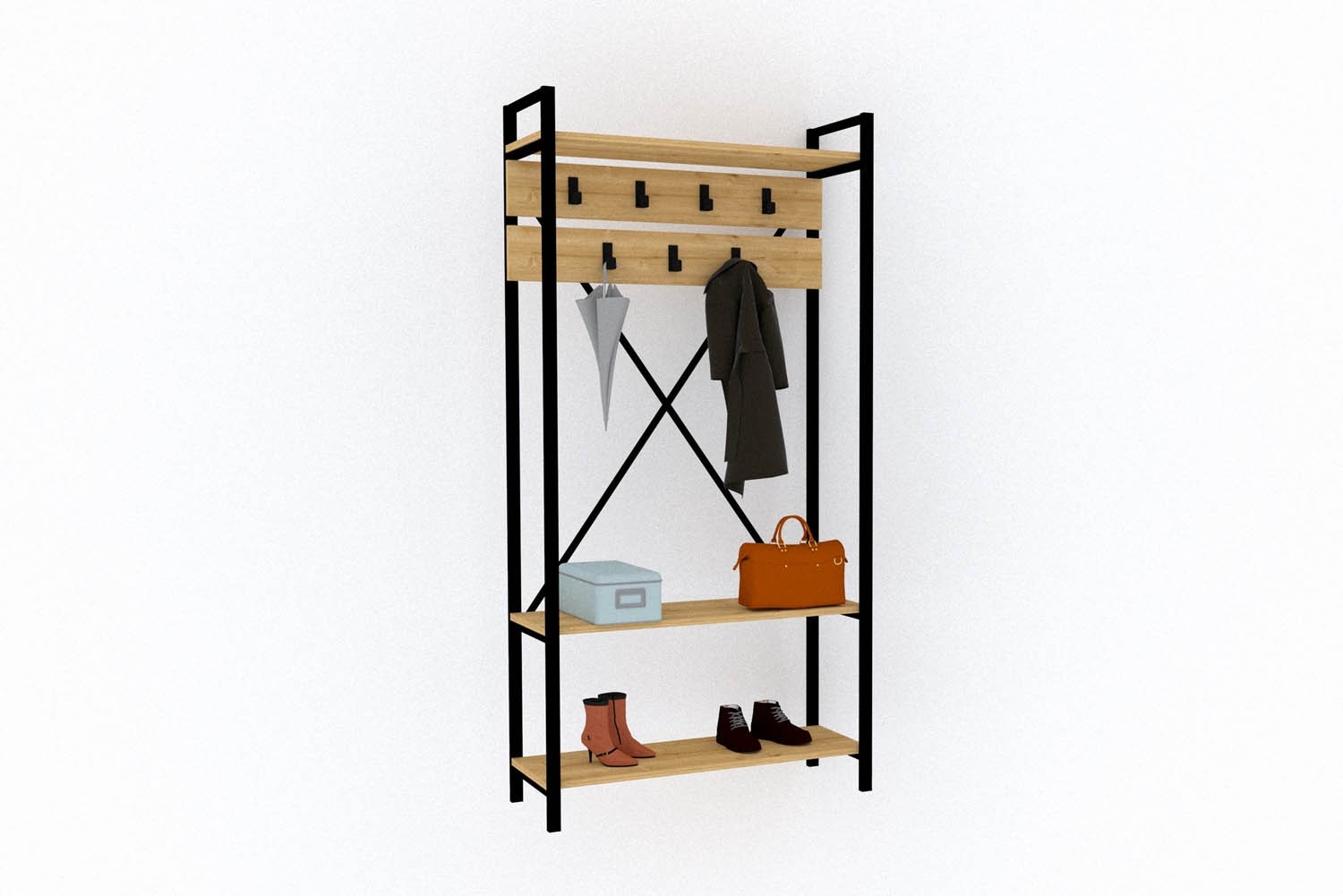Privoščite si nakup praktičnega obešalnika za predsobo MORGANA, ki je precej več kot to. Ker stoji na kovinskih nogah je zlahka premakljiv in ga lahko postavite kamorkoli želite. Zraven obešalnikov nudi dve polici, ki ju lahko izkoristite za vašo obutev in torbice. Obešalnik MORGAN je narejen v modernem stilu.