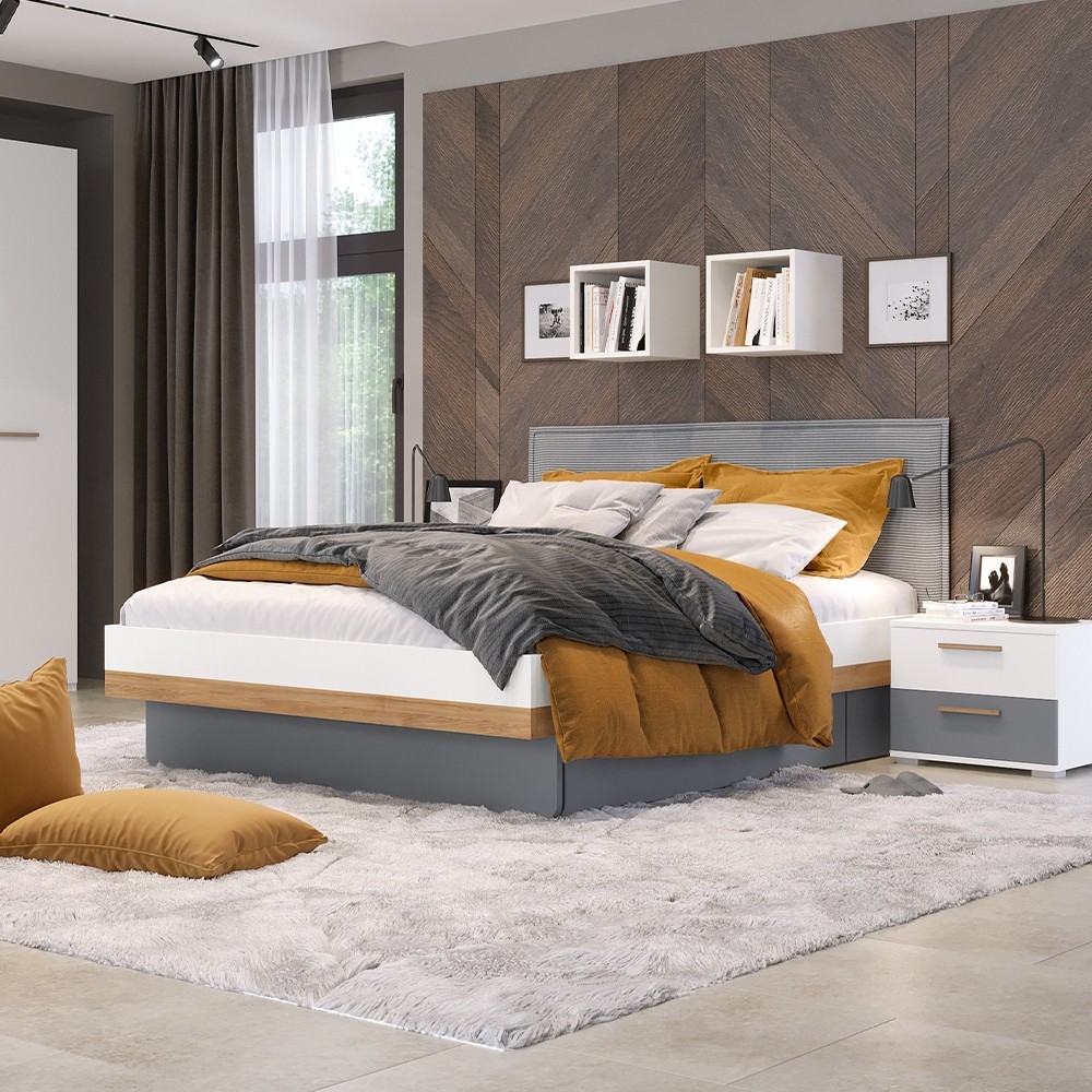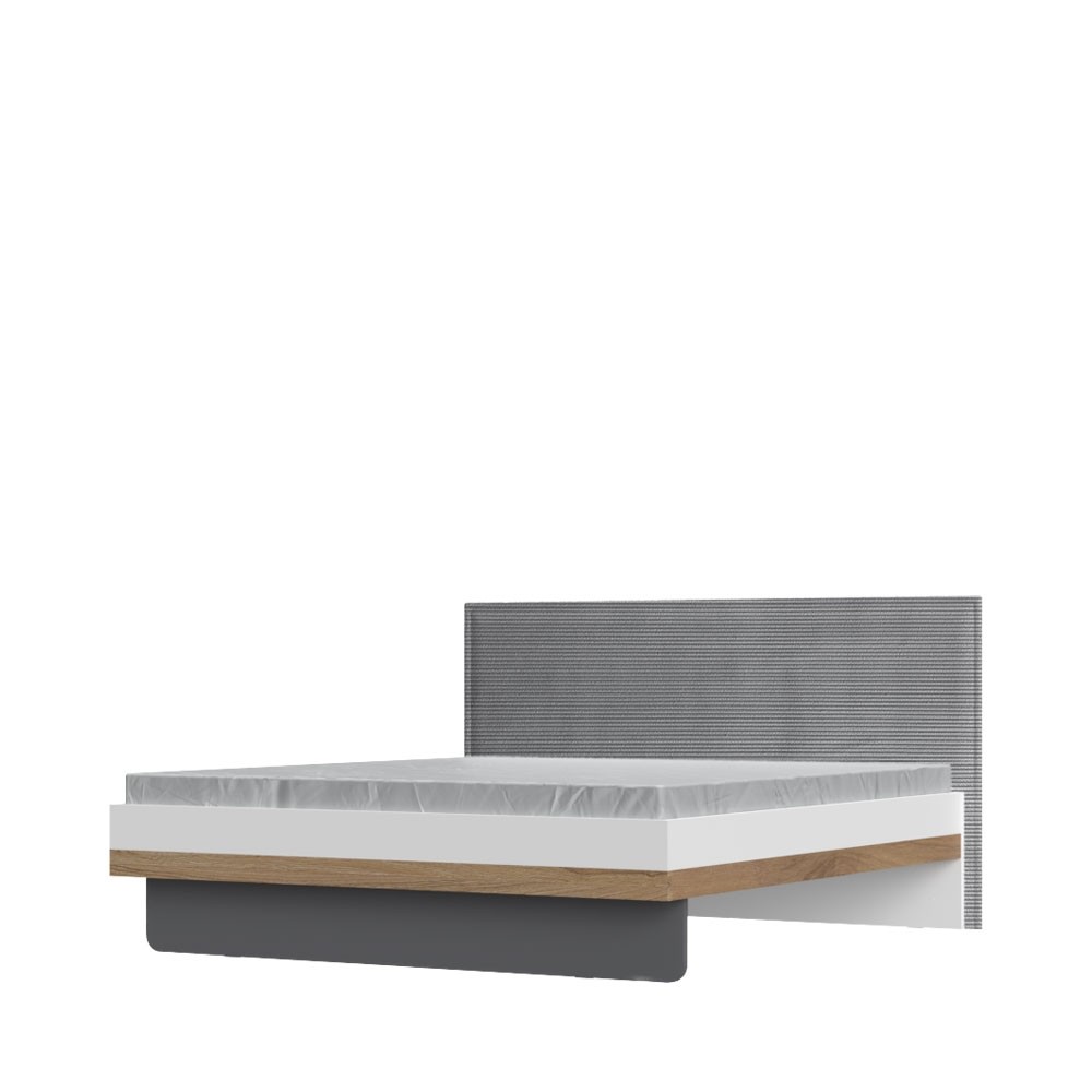 Postelja ARC 180 cm je narejena v barvni kombinaciji pacifiškega oreha in bele mat lak barve. Oblazinjeno vzglavje v sivi barvi dodaja mehko udobje, ki je idealno za večerno sproščanje. Minimalistični dizajn omogoča, da je ta postelja popolna za vsako spalnico. Vzmetnica ni vključena v ceno.