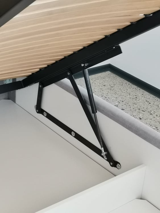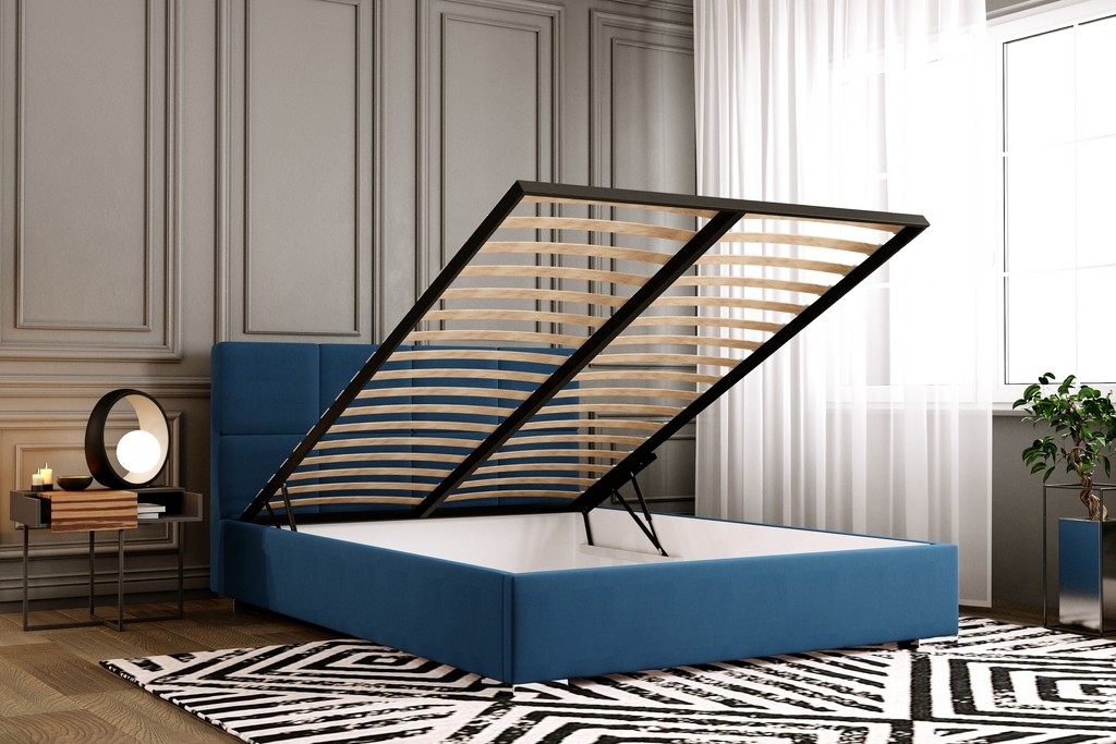 Oblazinjena postelja BRIK ima dvižni mehanizem, ki se z lahkoto uporablja in vam nudi izkoristek celotnega prostora pod posteljo za shranjevanje posteljnine, letnih oblačil, vzglavnikov in odej ter ostalih poljubnih predmetov. Vaše omare bodo zato ostale lepo urejene in ne bodo prenatrpane. Predal pod posteljo je razdeljen na dva dela in je visok približno 14 cm.