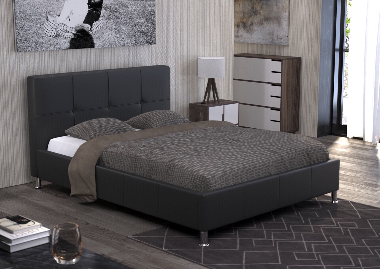 Oblazinjena postelja MUNI je oblazinjena v umetno usnje v črni barvi, ki se lepo poda v vsako spalnico in jo naredi bolj prefinjeno in bogato! Vzglavje postelje je prešito v obliki velikih kvadratov, kar še dodatno izboljša videz postelje. Ima okrogle nogice višine 10 cm, zato lahko brez težav odstranite prah in umazanijo, ki se nabere pod postelje in tako poskrbite za vselej čisto in svežo spalnico!