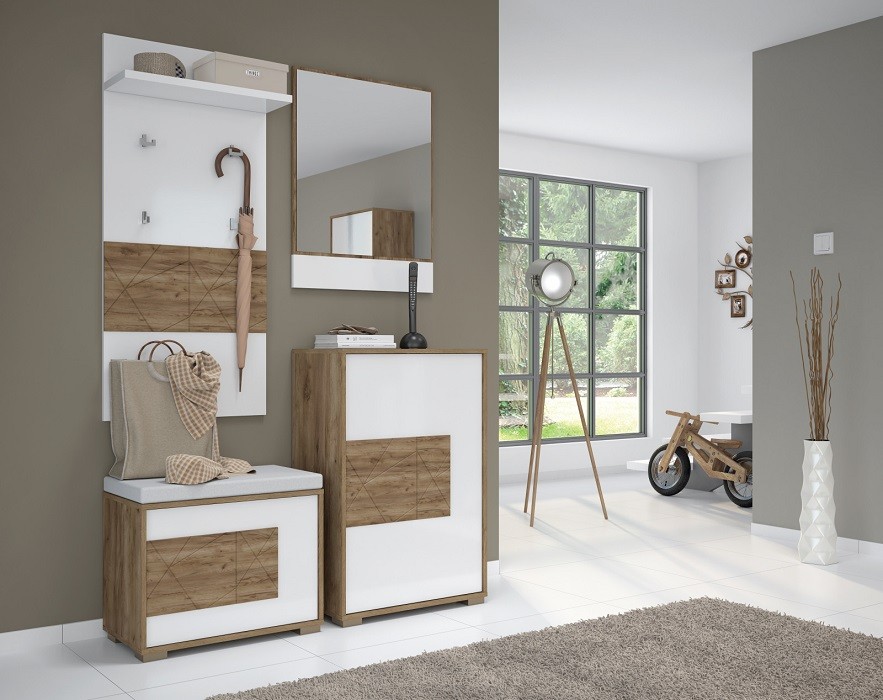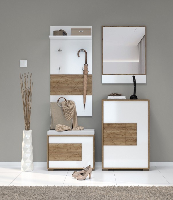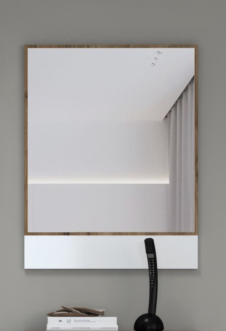 Podlaga ogledala je narejena iz oplemenitene iverne plošče (38 mm) v beli barvi visoki sijaj, ki je lakirana z UV lakom. Leseni dodatki v hrast barvi so narejeni iz MDF materiala. Robovi so ABS (mehki robovi).