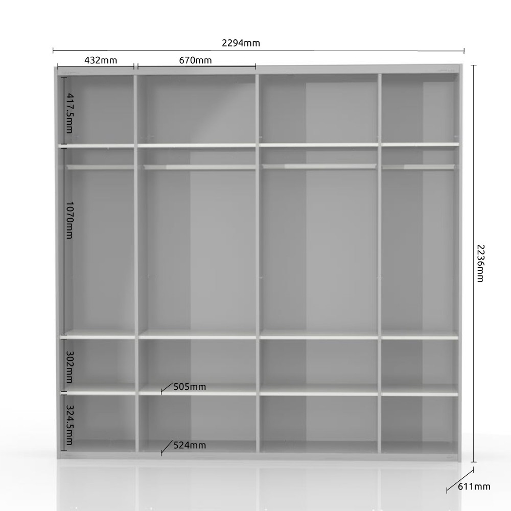 Izjemno funkcionalna in elegantna garderobna omara KALLA GALA ima kar 12 polic in 4 palice za obešanje, zato bodo vaša oblačila in modni dodatki vedno dobro organizirana in lepo pospravljena! Vratca imajo funkcijo tihega zapiranja, ki pripomore k lažji vsakodnevni uporabi in prepreči nastajanje poškodb. Fronte so premazane z UV lakom, ki naredi omaro bolj odporno na vlago, praske in poškodbe.