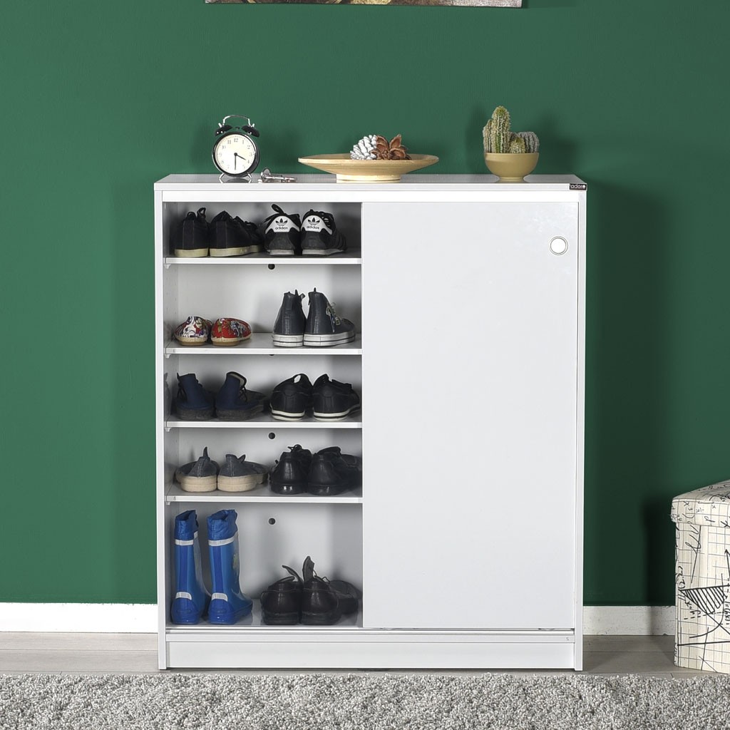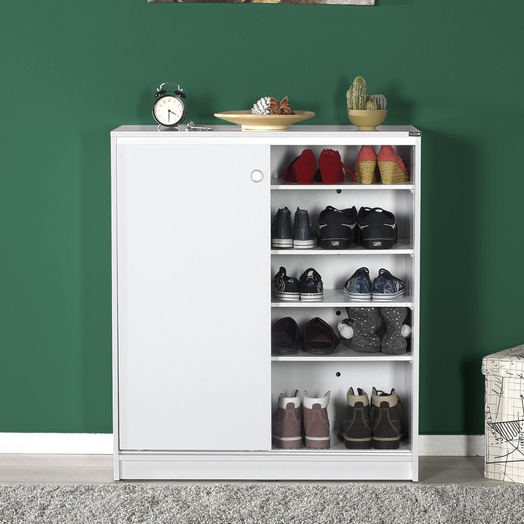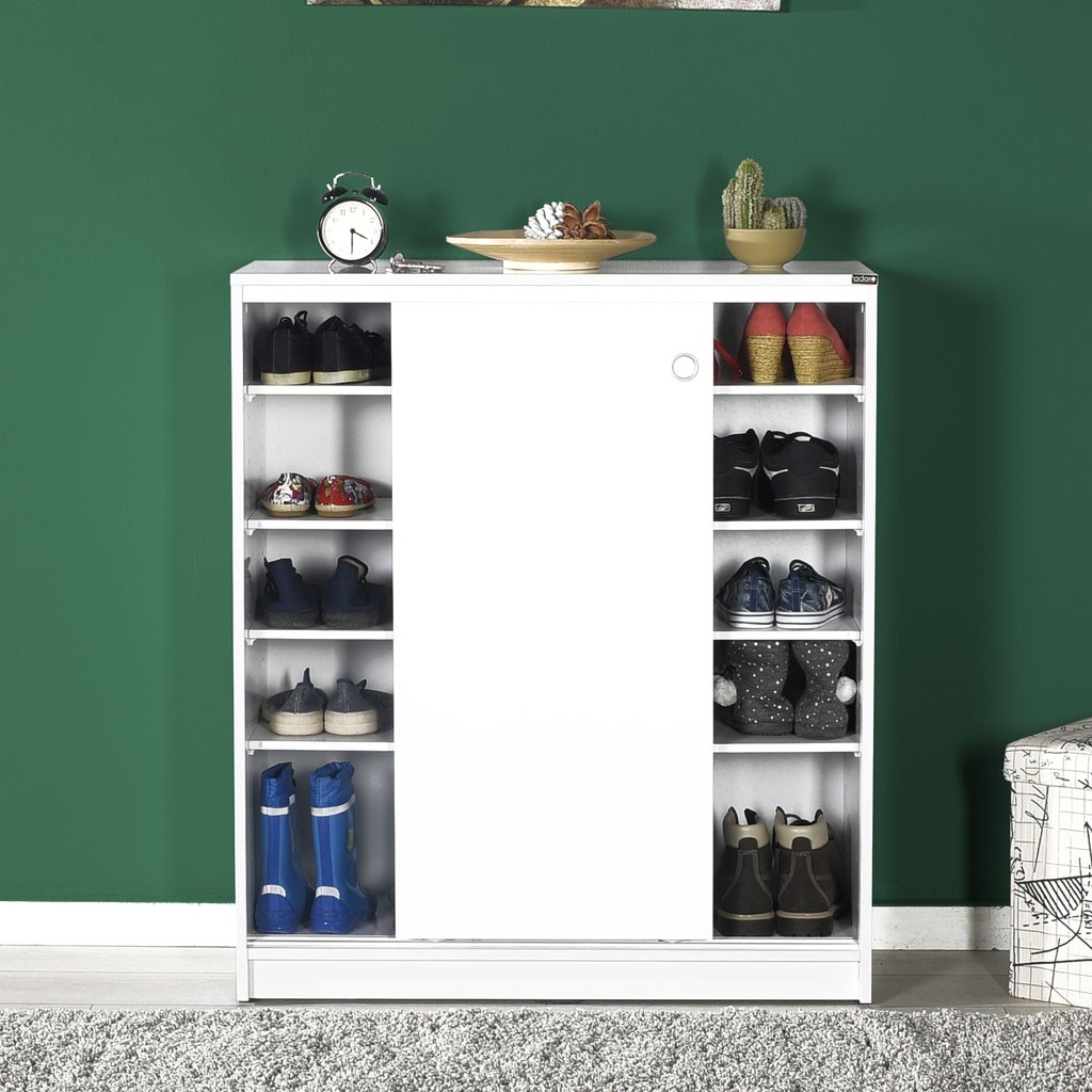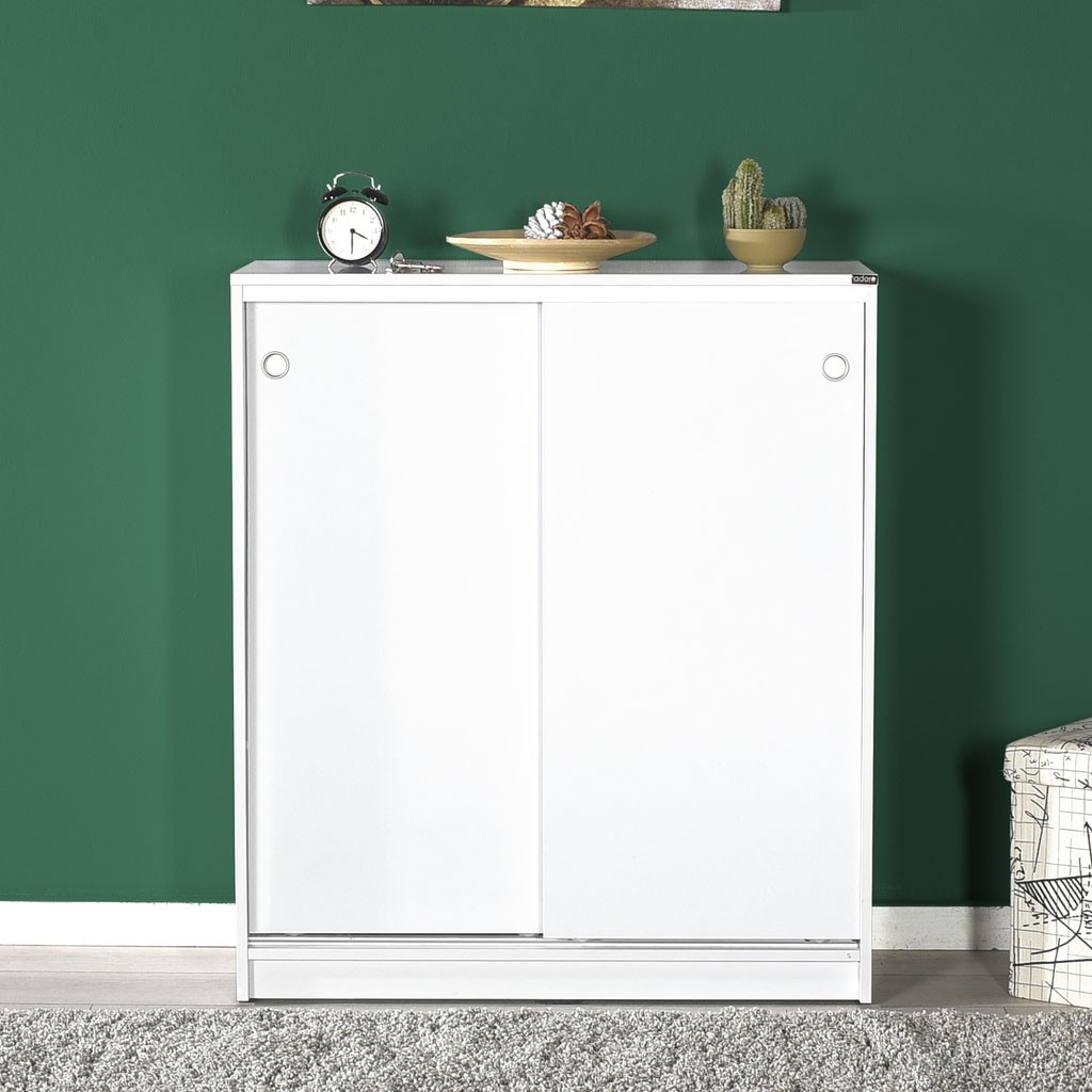 Preprosta omara za čevlje ADRON 322 s praktičnimi drsnimi vrati je na voljo v nevtralni beli barvi, ki se lepo poda v vsako predsobo. V notranjosti ima štiri premične police, ki vam omogočajo shranjevanje 25 parov čevljev, zato bo vaša predsoba vedno urejena.