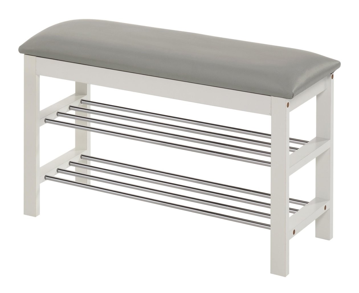Omara za čevlje Clain z MDF in furnirjem, krom jeklom in sivim oblazinjenjem. Klasična bela in siva kombinacija za eleganten in funkcionalen prostor.