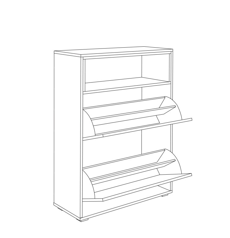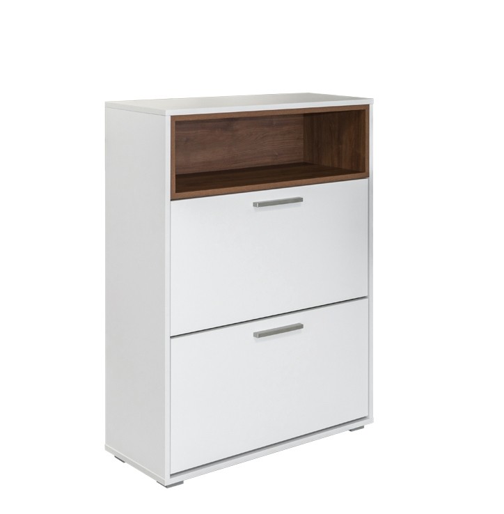 Priročna omarica za čevlje YUNO ima dva predala za shranjevanje čevljev ter odprto odlagalno polico, kamor lahko pospravite pošto in ključe, ali kape in rokavice. Na voljo je v moderni barvni kombinaciji bele mat barve in oreha, ki izgleda odlično v vsaki predsobi, hkrati pa jo naredi bolj funkcionalno.