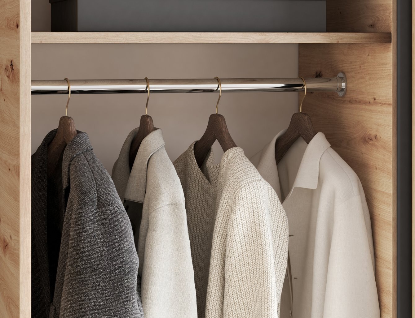 V notranjosti ponuja omaro Emerio II praktičen drog za obešanje oblačil, ki zagotavlja urejeno shranjevanje. Kombinacija stila, vzdržljivosti in vsakodnevnega udobja naredi to omaro nepogrešljiv dodatek za vaš dom, ki vam bo služil dolgo časa.