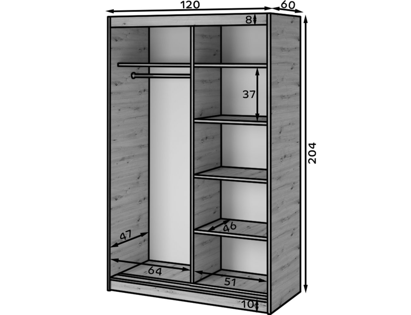 Ta garderobna omara je izdelana iz trpežne laminirane iverne plošče v privlačni barvi hrasta artisan, sprednji del pa je estetsko zaključen z ABS robom, odpornim na poškodbe. Garderobna omara ima dvoje drsnih vrat z ogledalom, ki ne samo, da prihranijo prostor, ampak tudi vizualno povečajo prostor, v katerem se nahaja. Opremljena je s sodobnim mehanizmom Laguna Fast, ki zagotavlja gladko in tiho delovanje vrat.