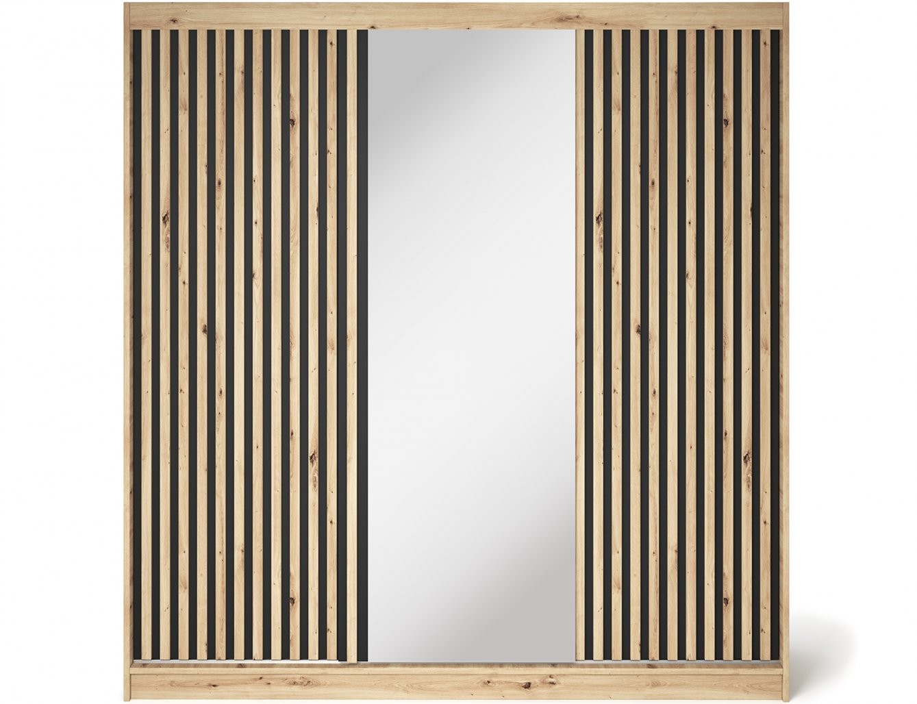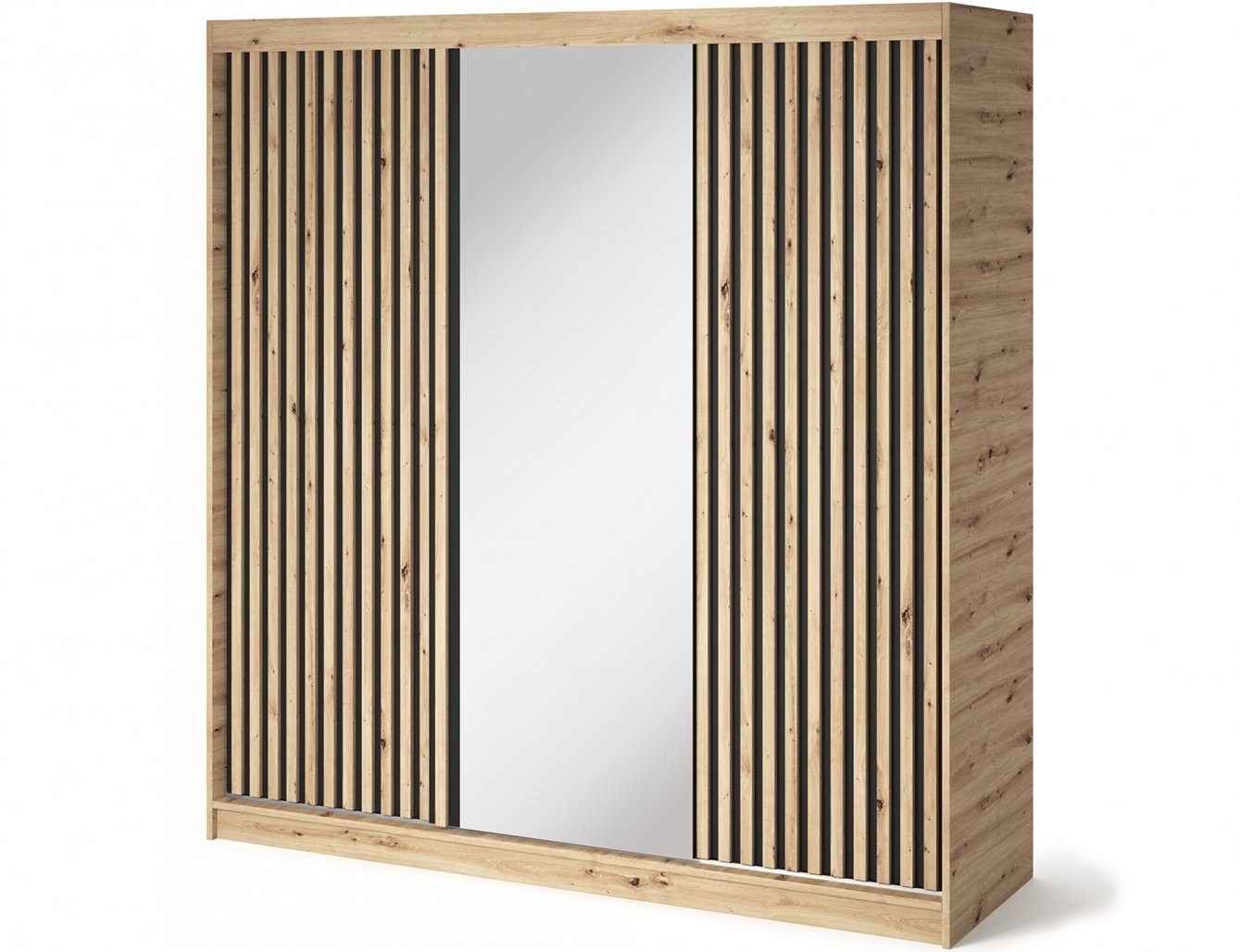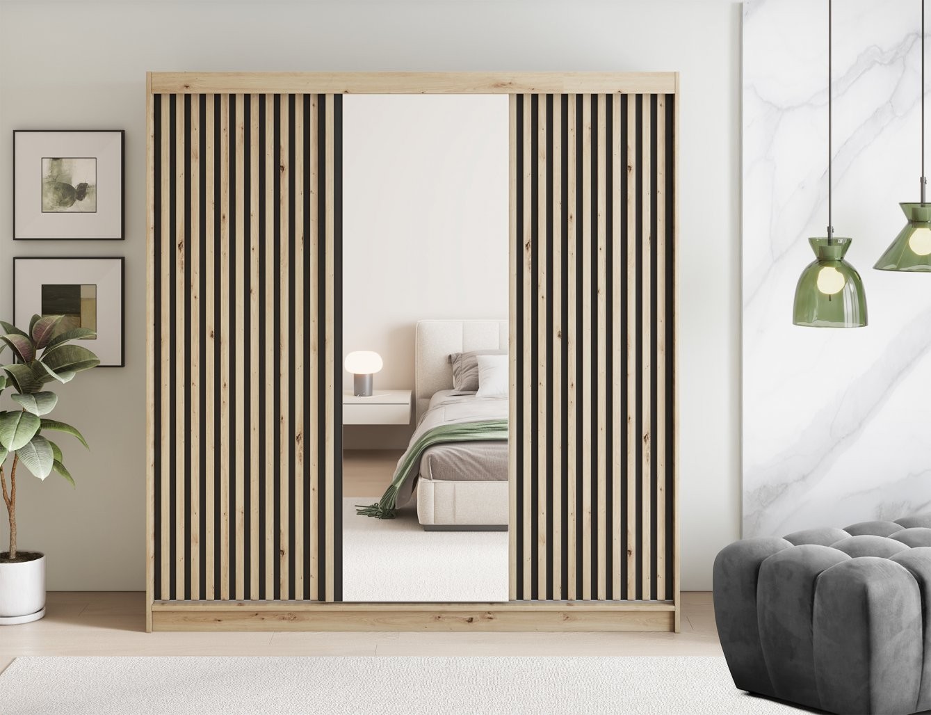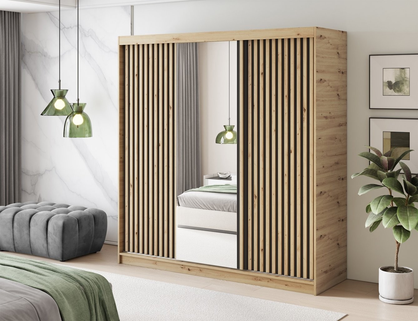 Izdelana je iz trpežne laminirane iverne plošče v privlačnem odtenku hrasta artisan, kar ji daje naraven in topel videz. Sprednje plošče so obrobljene z ABS robovi za dodatno zaščito in daljšo življenjsko dobo. Ena izmed drsnih vrat ima vgrajeno ogledalo, ki vizualno poveča prostor in je izjemno praktično za vsakodnevno uporabo.