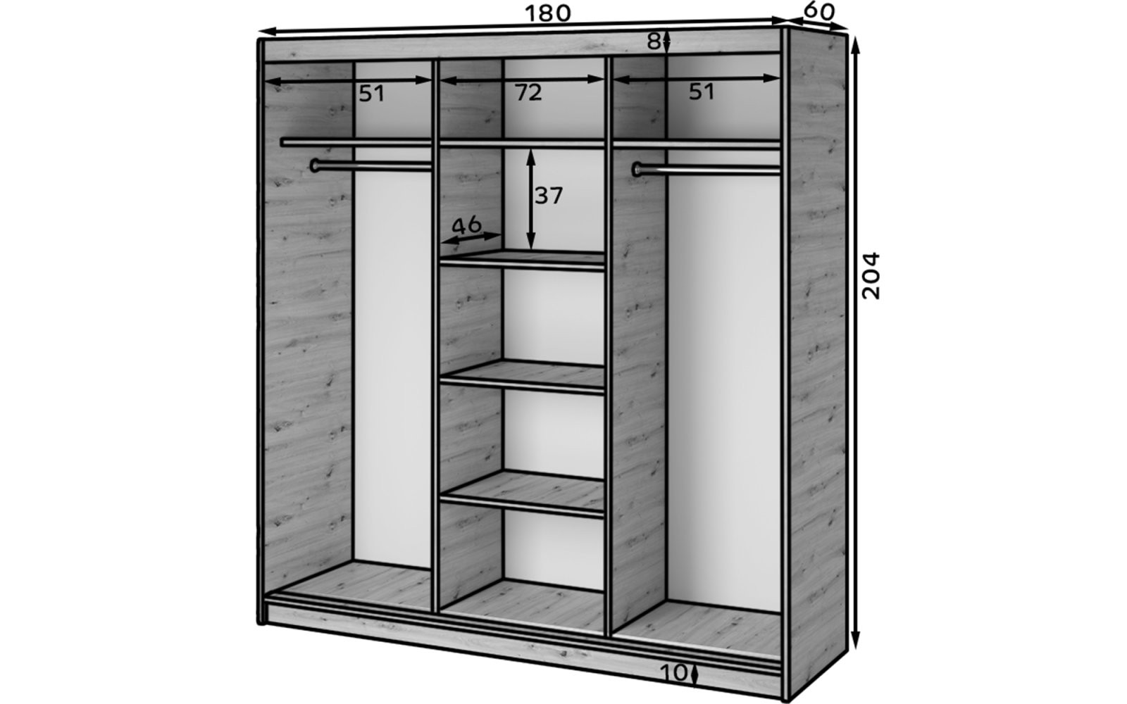 Omare z drsnimi vrati Emerio III, dimenzij 180x204x60 cm, je moderna in funkcionalna izbira za spalnico, garderobno sobo ali predsobo. Ta garderobna omara združuje estetiko, trajnost in praktičnost, ter je idealna rešitev za sodobno opremljene prostore, kjer je prostor dragocen.