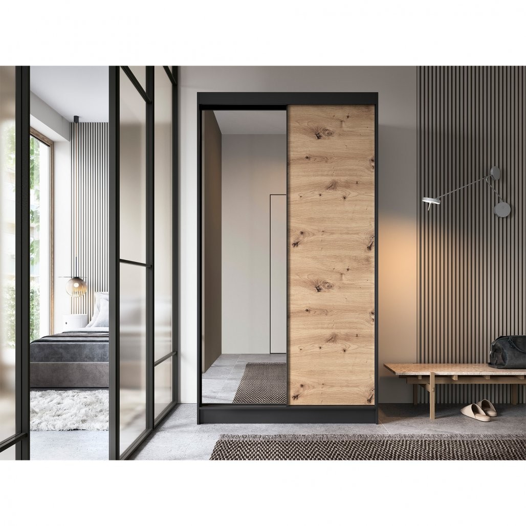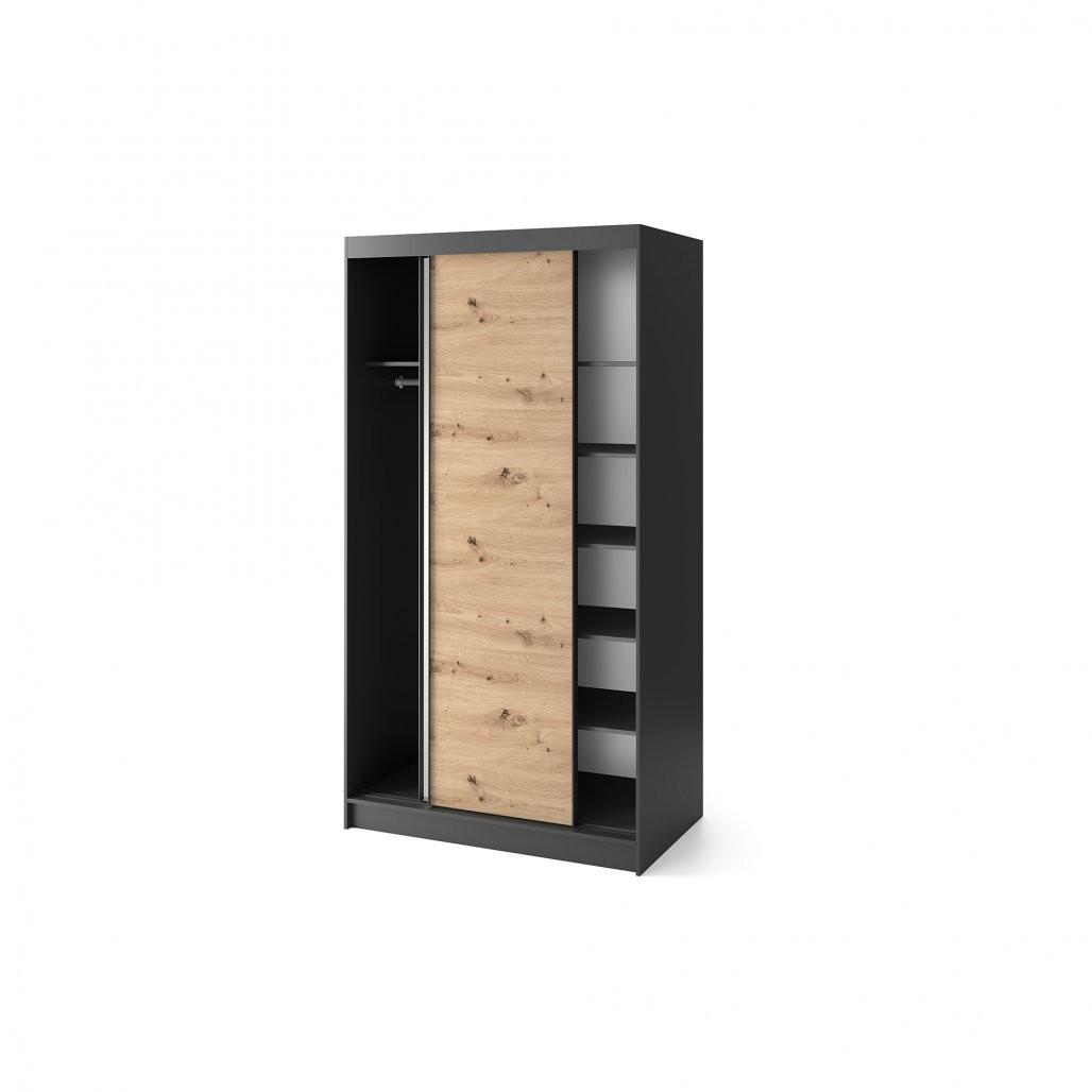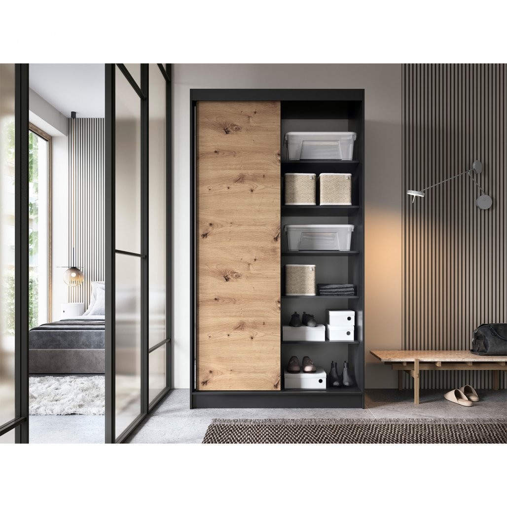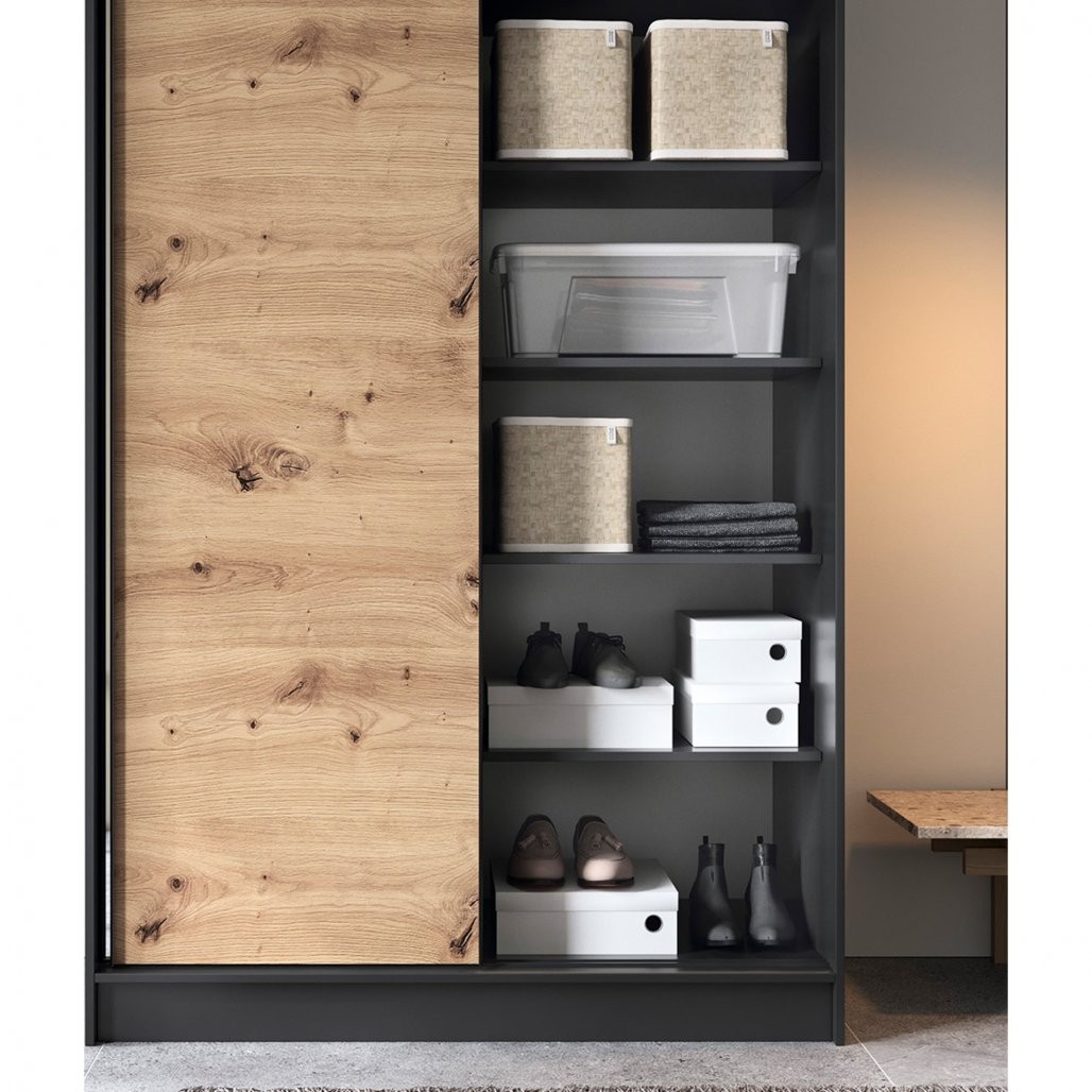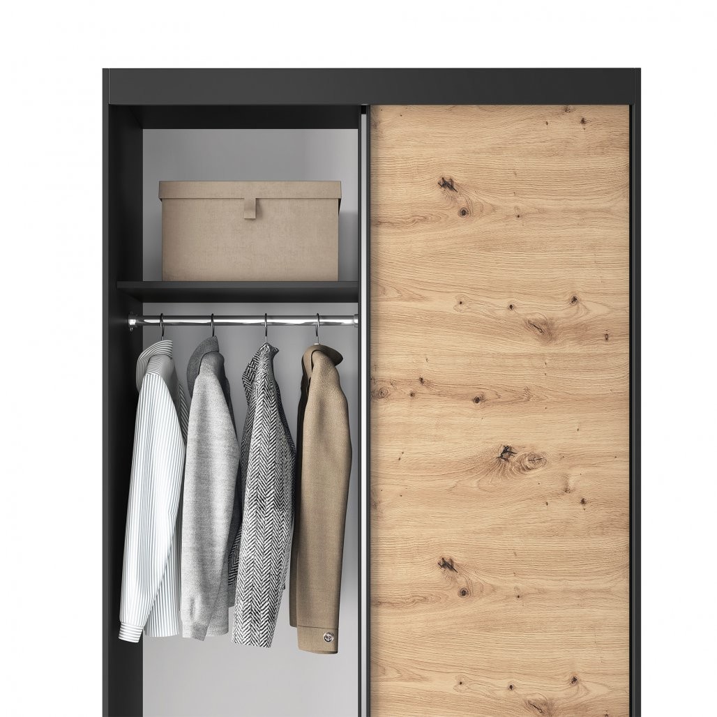 Kombinacija barv artisan hrasta in mat črnega tona daje omari sodoben in eleganten značaj, ki se lepo ujema z različnimi stili notranjosti. Telo omare je izdelano iz trdne 16 mm debele MDF plošče, ABS rob na robovih pa pohištvo ščiti pred poškodbami in mu daje eleganten videz. To pohištvo je funkcionalna rešitev za shranjevanje in privlačen dekorativni element, ki vašemu prostoru dodaja edinstven značaj.