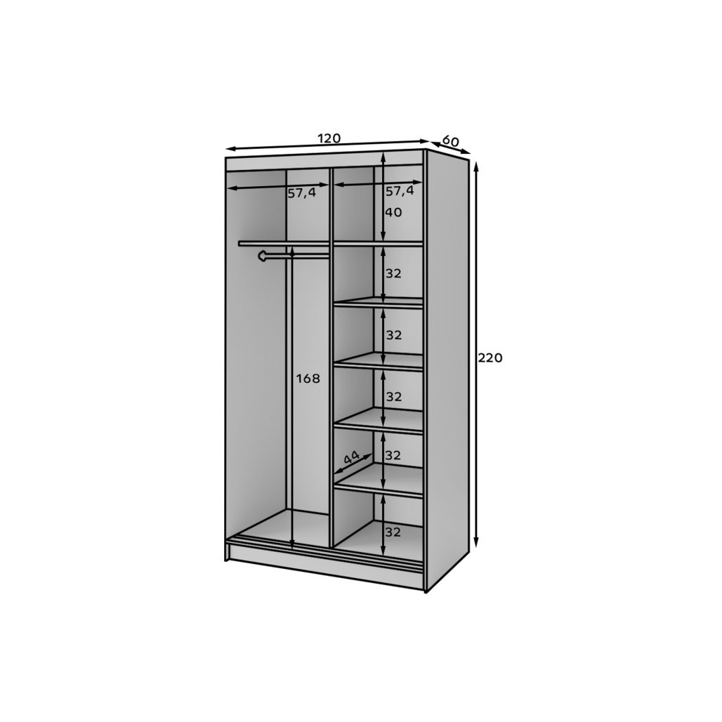 Omaro Esville II odlikuje skrbno zasnovana notranjost, ki omogoča učinkovito izkoriščanje prostora. V notranjosti boste našli 6 polic, od katerih vsaka zdrži do 10 kg obremenitve. Poleg tega priložene obešalne palice omogočajo urejeno shranjevanje oblačil. Drsna vrata, ki jih je dvoje, omogočajo priročno odpiranje in zapiranje brez potrebe po velikem prostoru okoli omare. Ogledalo na vratih doda dodaten čar in ustvarja občutek večjega in prostornejšega ambienta.