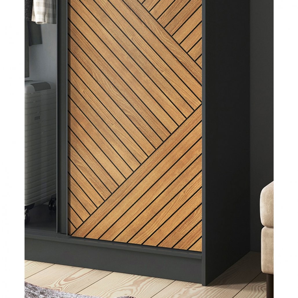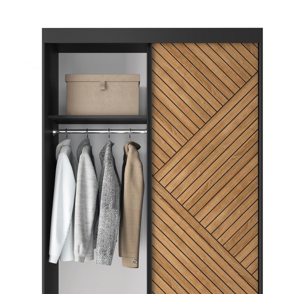 Izdelana iz trpežnega 16 mm debelega MDF-a, Omare z drsnimi vrati Marrphy II niso le estetsko privlačne, temveč tudi izjemno masivne in odporne. ABS robni trakovi ne dodajajo le vzdržljivosti, ampak prispevajo tudi k estetiki, ustvarjajoč skladen in urejen videz. Z notranjostjo, ki vključuje šest polic z maksimalno nosilnostjo 10 kg in palice za obešanje oblačil, omara zagotavlja varno shranjevanje in pomaga pri ohranjanju reda.