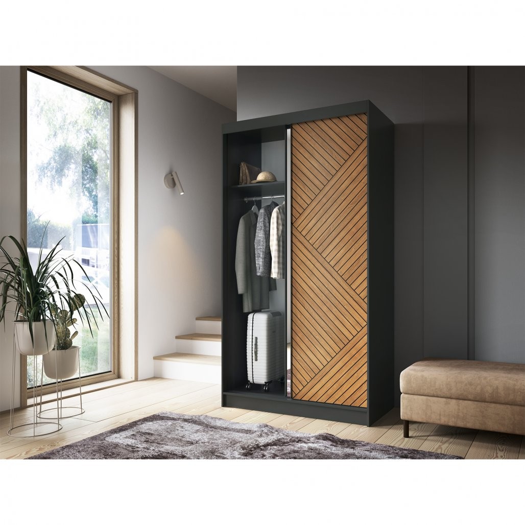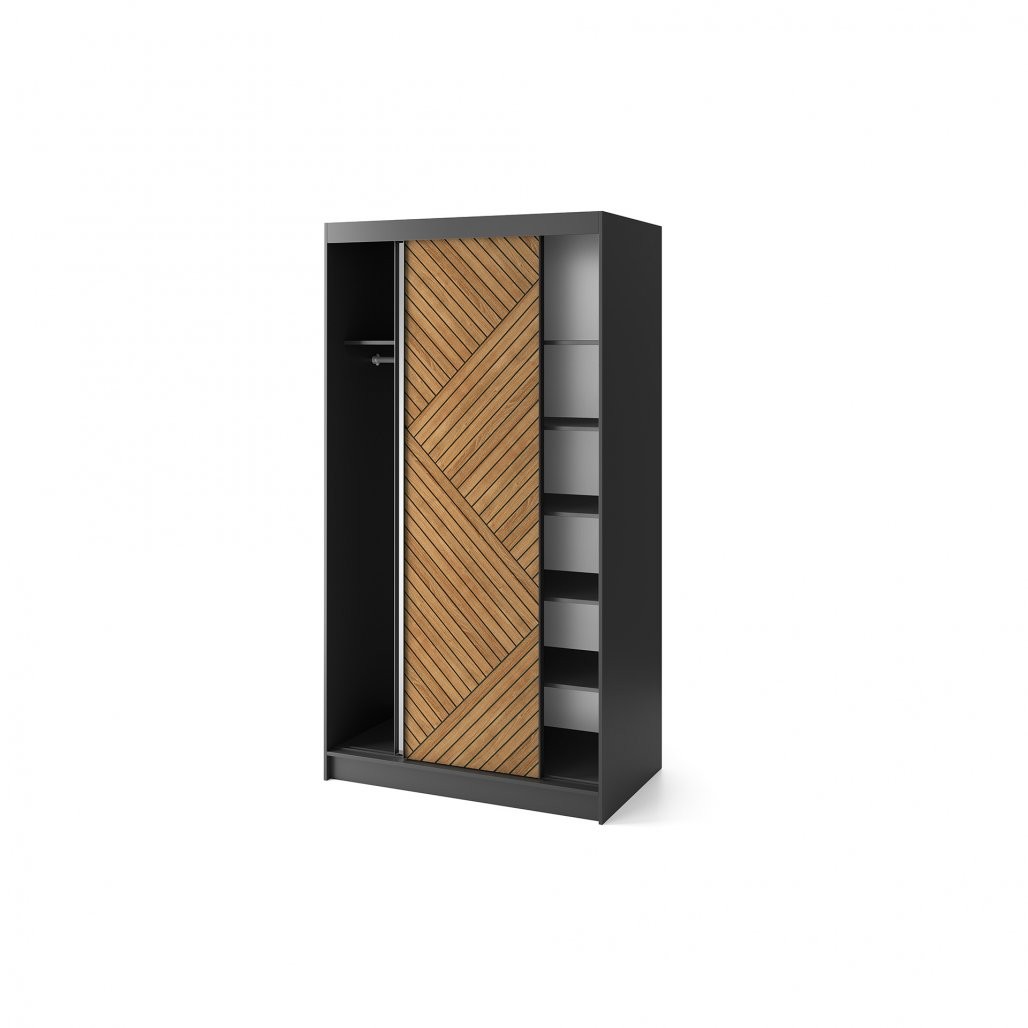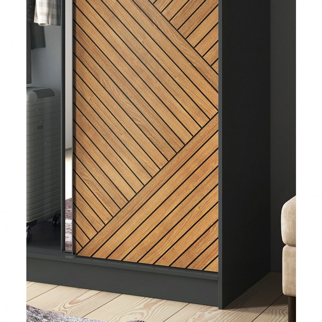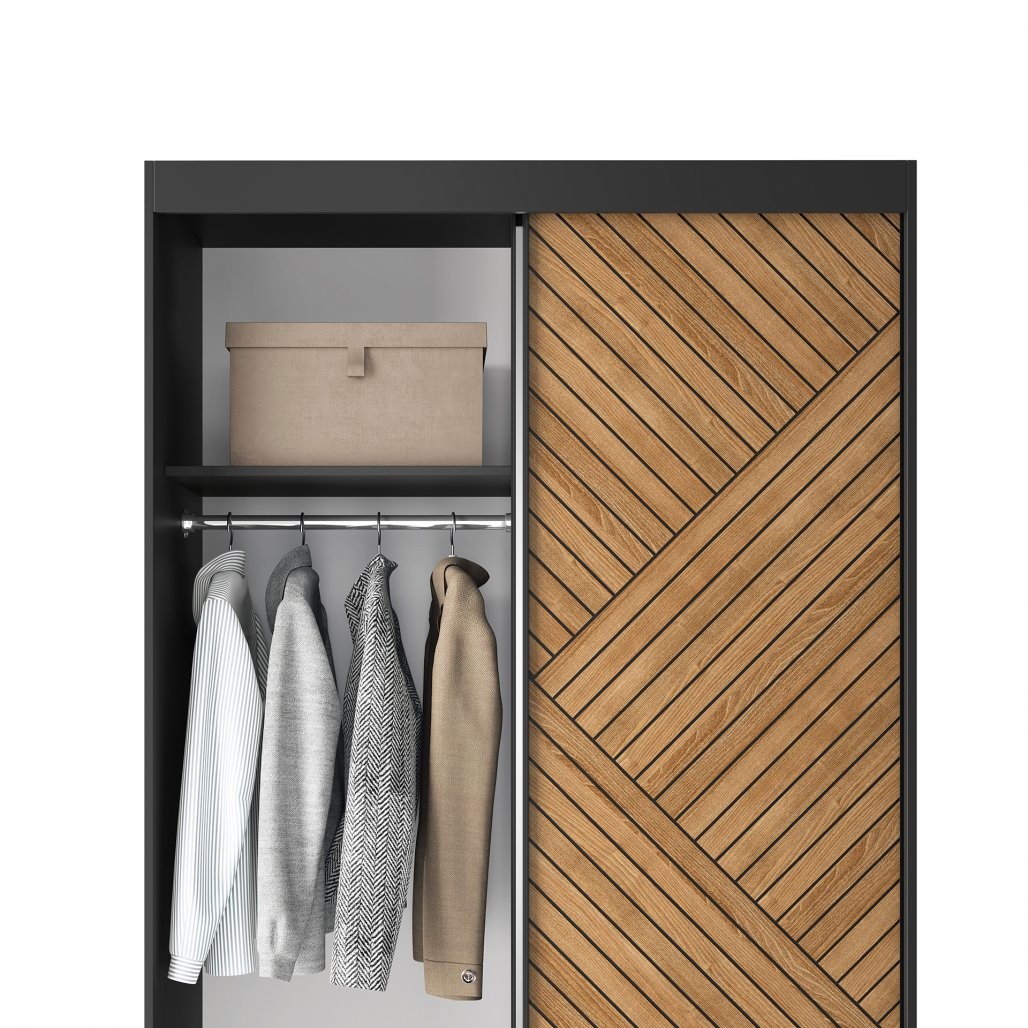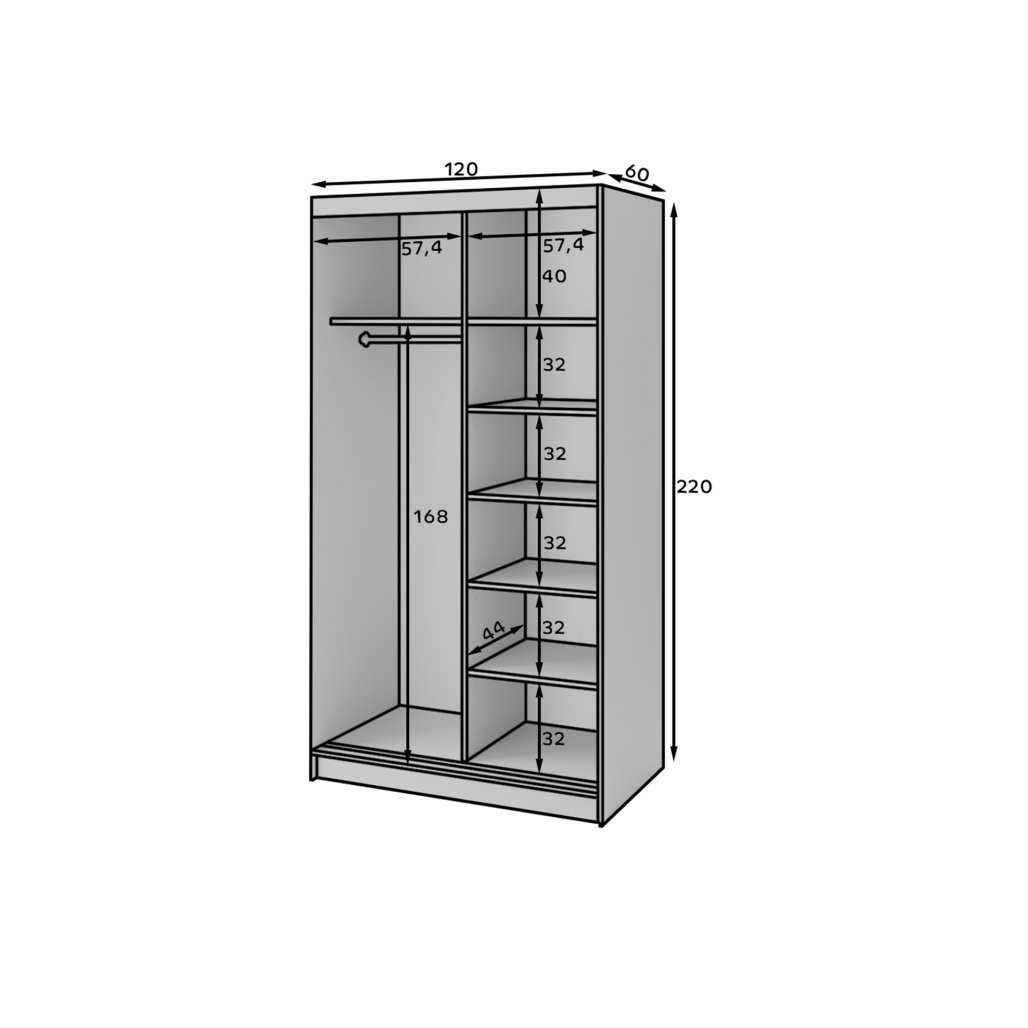 Omaro odlikuje premišljeno zasnovana notranjost, ki ponuja šest polic za shranjevanje raznih predmetov, ter priloženi palici za obešanje oblačil, kar pripomore k ohranjanju reda in organizaciji. Dvoje drsnih vrat prihrani prostor v sobi in se odpira gladko ter tiho zahvaljujoč črno obarvanemu mehanizmu. Poleg tega priložene zrcalne plošče vizualno povečajo prostor in nudijo praktičen element za vsakodnevno pripravo.