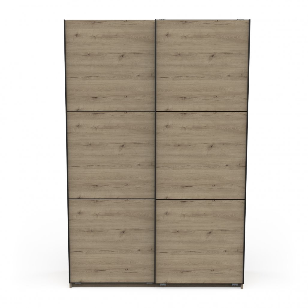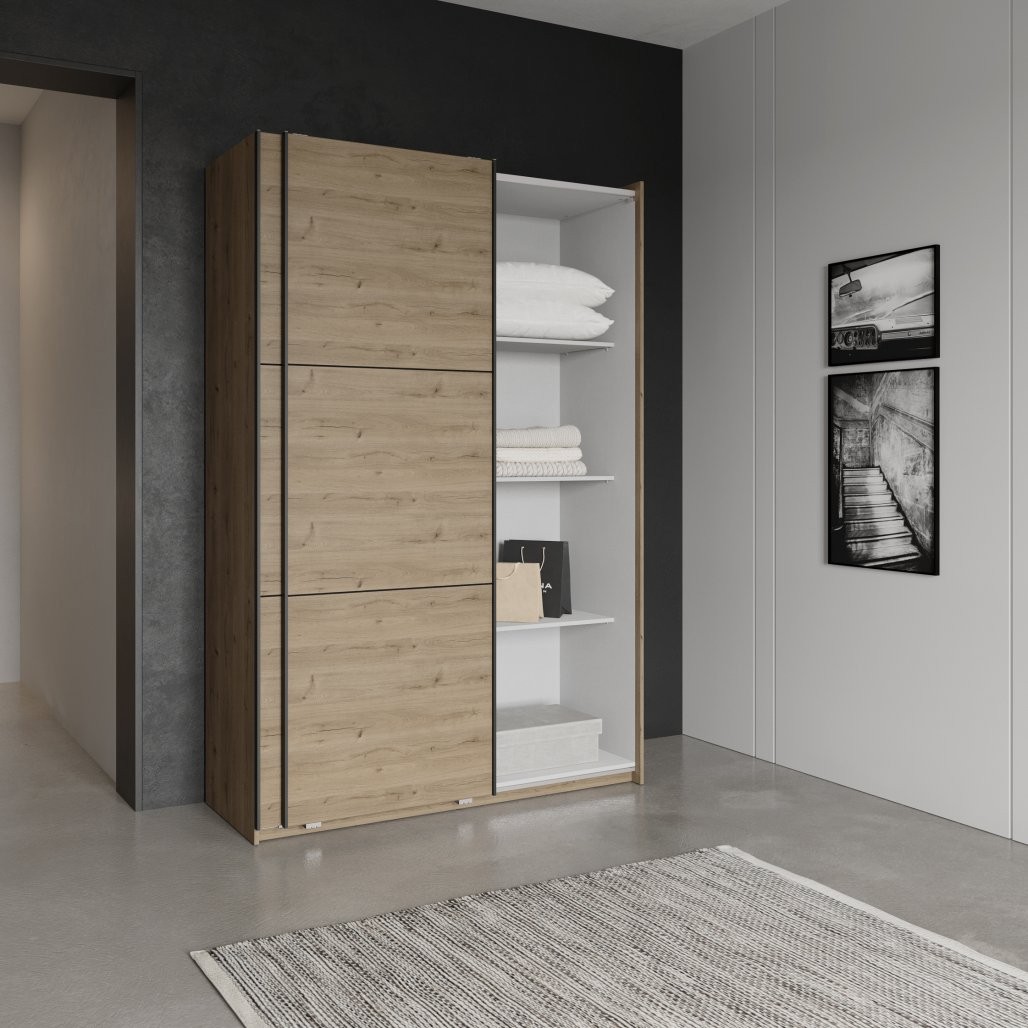 - Sodobna garderobna omara z drsnimi vrati, na voljo v povsem beli barvi ali barvi hrasta s črnimi poudarki