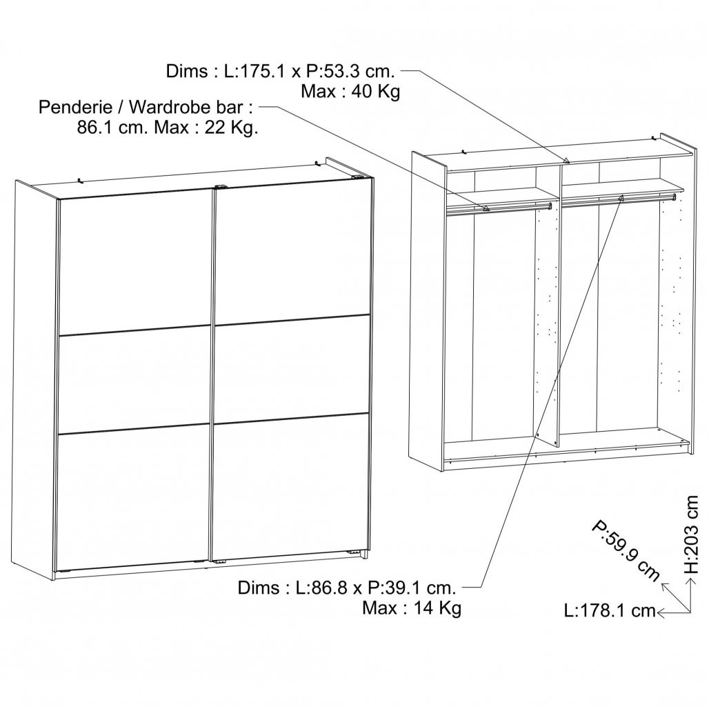 - Garderobna omara je opremljena z dvema robustnima fiksnima policama, vsaka z nosilnostjo do 14 kg za vaša zložena oblačila, dvema obešalnima letvicama, vsaka z nosilnostjo do 22 kg za obešanje oblačil ter robustno vrhnjo ploščo z največjo obremenitvijo do 40 kg za večje predmete