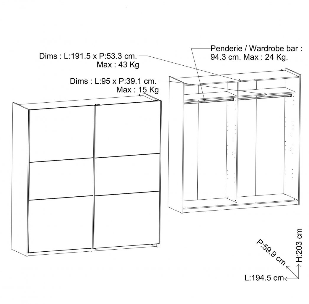 - Garderobna omara je opremljena z dvema robustnima fiksnima policama, vsaka z nosilnostjo do 15 kg za vaša zložena oblačila, dvema obešalnima letvicama, vsaka z nosilnostjo do 24 kg za obešanje oblačil ter robustno vrhnjo ploščo z največjo obremenitvijo do 43 kg za večje predmete