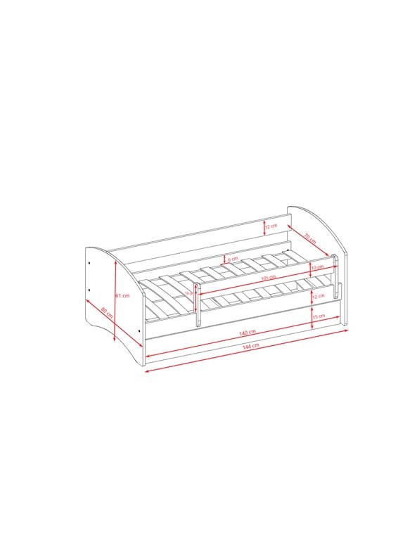 Postelja je zasnovana z mislijo na udobje in varnost. Opremljena je s premično varovalno ograjico dolžine 100 cm, ki prispeva k varnejši uporabi, zaobljeni robovi pa dodatno povečajo občutek varnosti. Vključen letveni pod nudi ustrezno oporo ležišču, ojačana konstrukcija pa prispeva k stabilnosti. Izdelek je na voljo s predalom ali brez predala ter z ležiščem ali brez ležišča, zato omogoča večjo prilagodljivost glede na potrebe uporabnika.