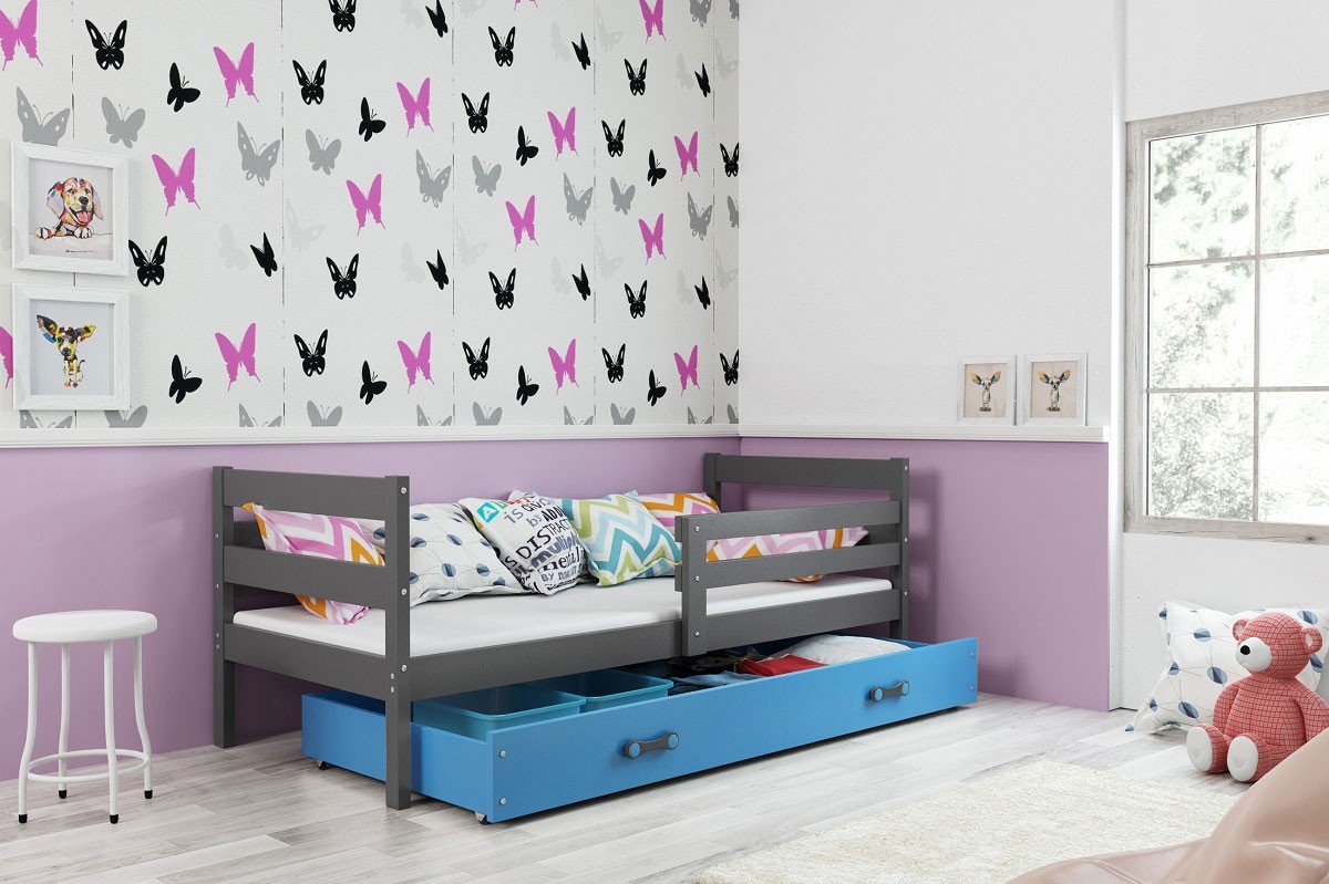 Otroška postelja ERYK je preprosta postelja moderne barve grafita, ki polepša in modernizira prostor. Postelja nudi tudi shranjevalni predal, ki pa ga lahko dobite v različnih barvah. Namenjen je za igrače, knjige, oblačila ali ostale vam pomembne stvari. Posteljni pod in ležišče sta vključena v ceno.
