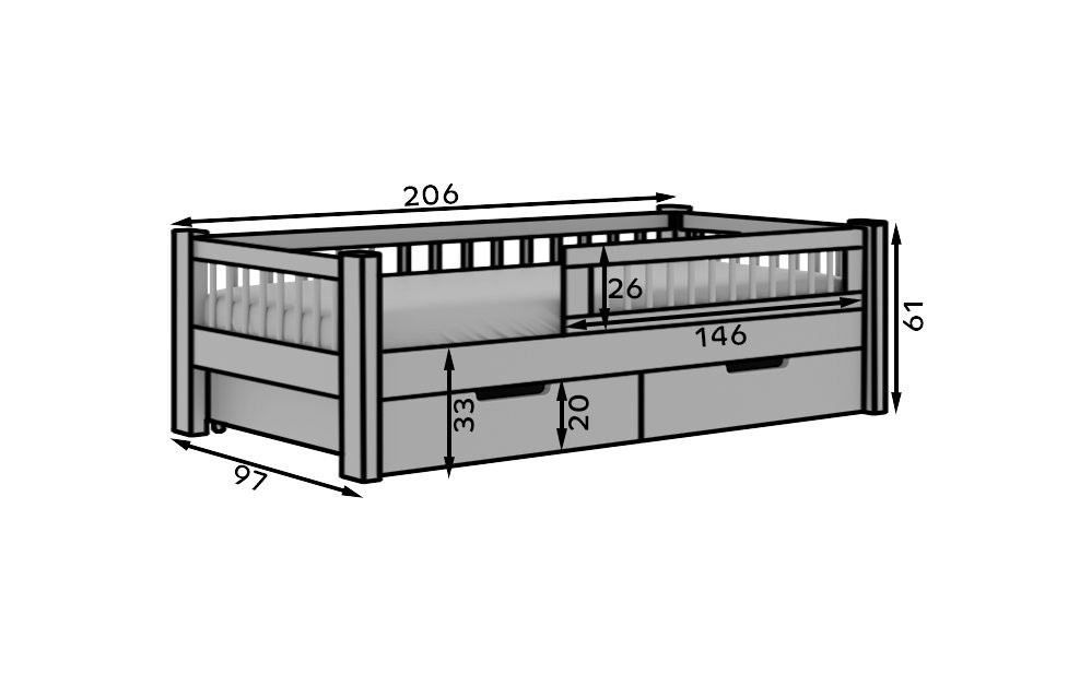 Postelja je izdelana iz kakovostnega borovega lesa, kar zagotavlja trdnost in dolgo življenjsko dobo. Vključena vzmetnica in trdna lesena letvena podlaga poskrbita za udoben spanec. Dva prostorna predala omogočata shranjevanje posteljnine ali igrač, kar pomaga ohranjati red v sobi.