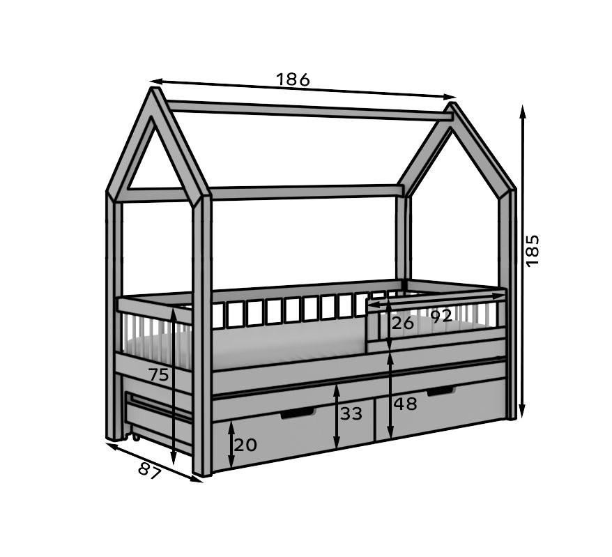 Otroška postelja Hiška Artes z vzmetnico je popolna izbira za starše, ki iščejo praktično in estetsko rešitev za otroško ali mladinsko sobo. Njena unikatna oblika hiške ustvarja prijetno in toplo vzdušje, ki spodbuja igro in sprostitev.