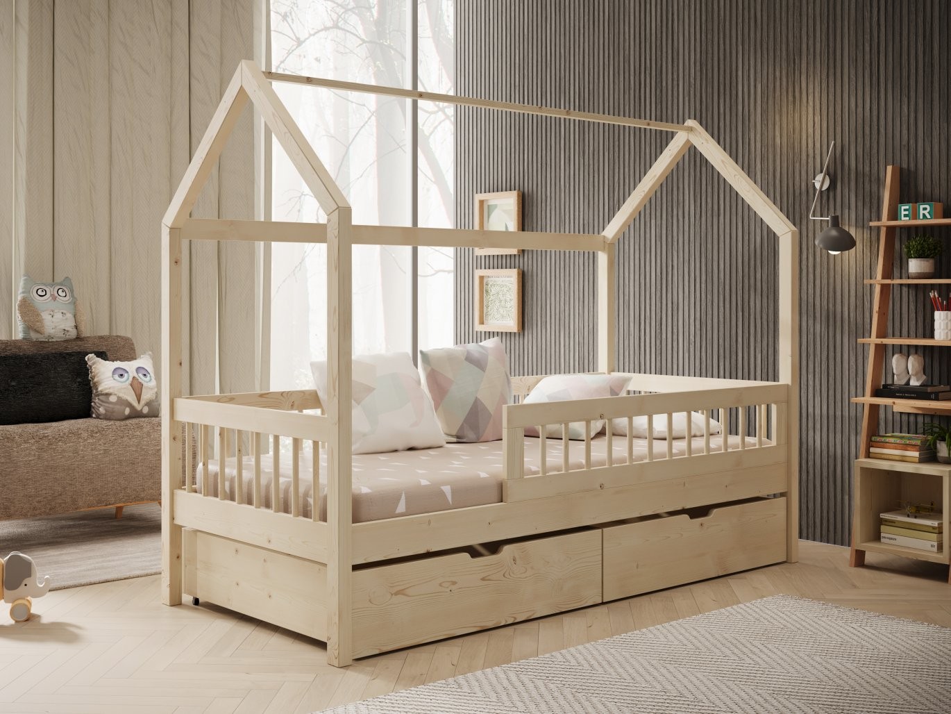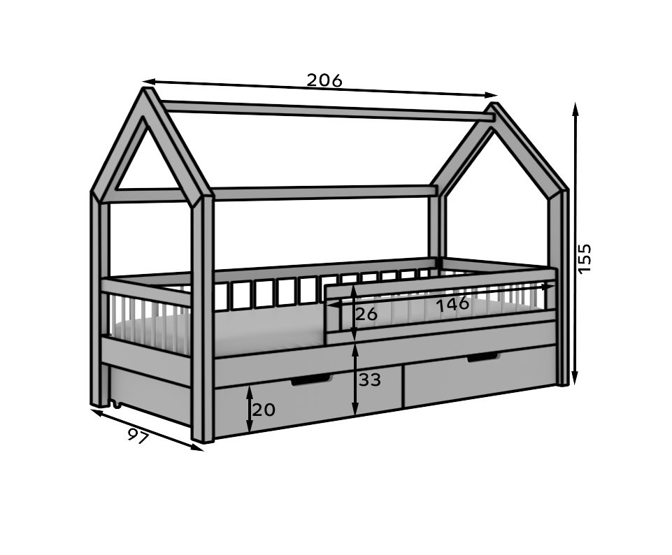 Otroška postelja hiška Galicja z vzmetnico je popolna izbira za vsako otroško sobo. S svojo edinstveno zasnovo v obliki hiške spodbuja domišljijo in ustvarjalnost, hkrati pa zagotavlja udobno in varno spanje. Skandinavski dizajn in naravni materiali ustvarjajo topel ambient, ki se lepo poda v vsak prostor.