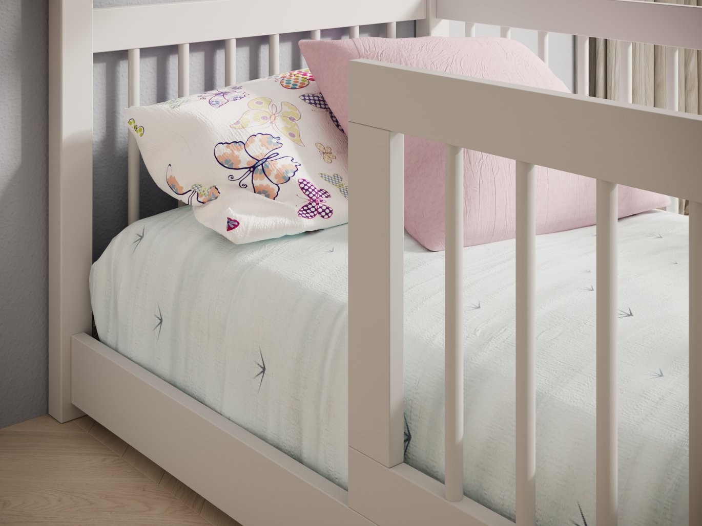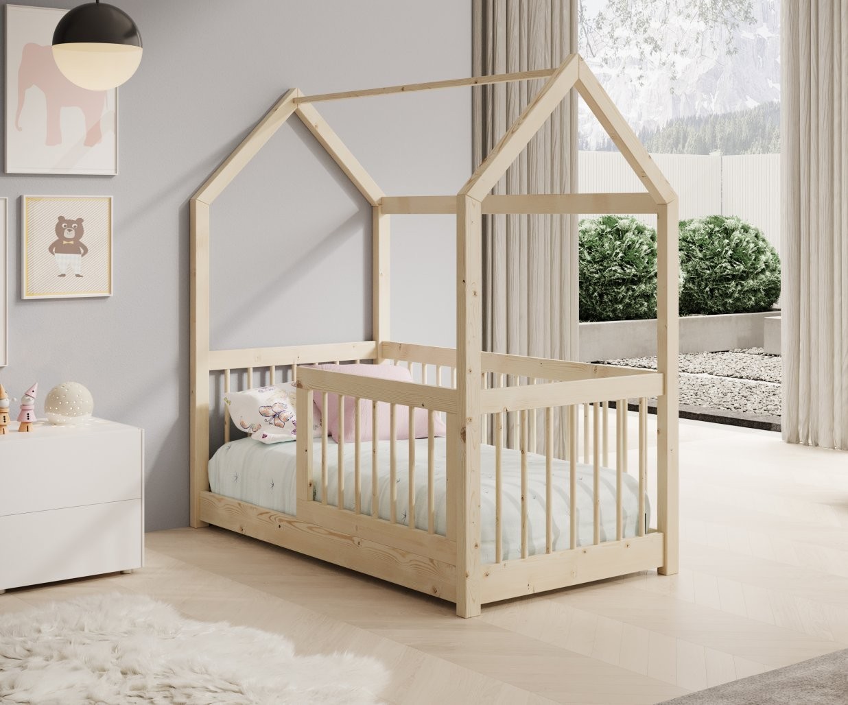Otroška postelja hiška Graja z vzmetnico združuje udobje, varnost in igriv dizajn v enem – idealna izbira za otroško sobo!