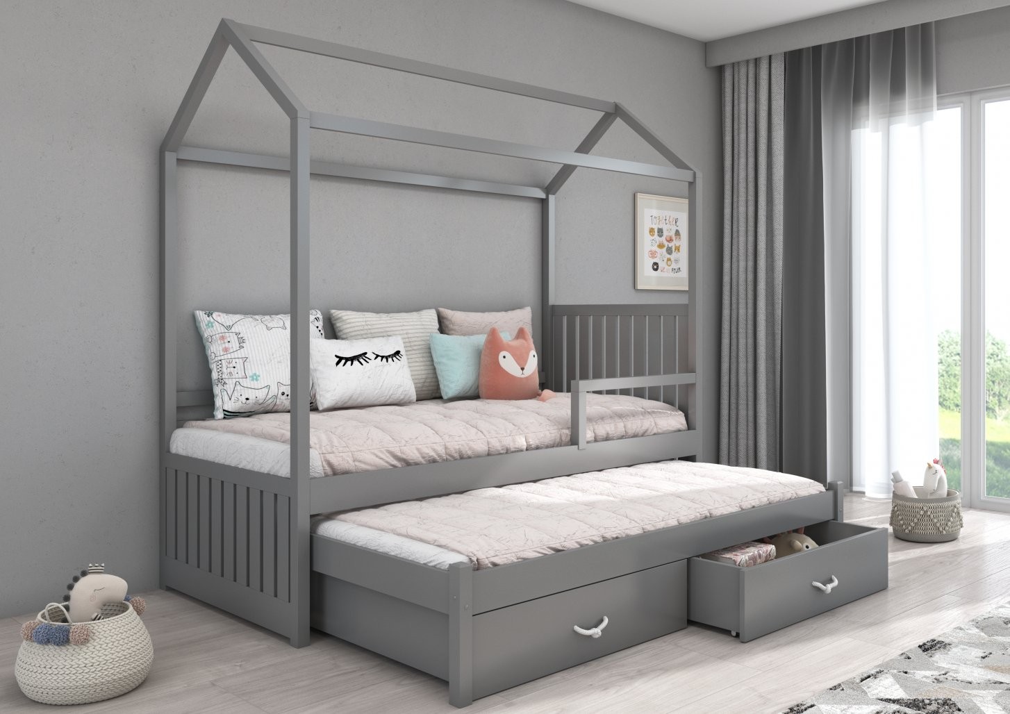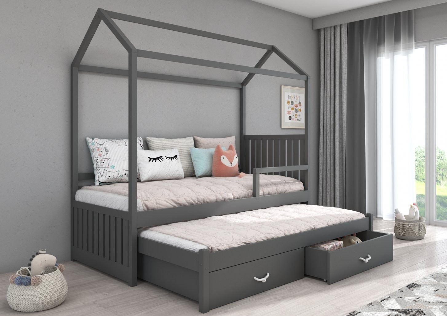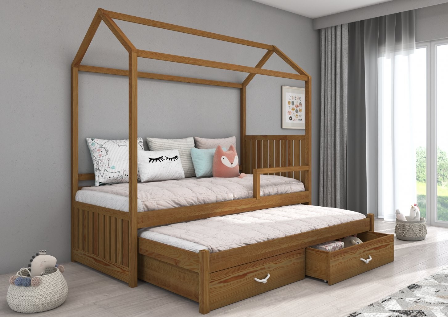 Otroška postelja hiška JONASZEK je čudovita izbira za vsako otroško sobo, saj s svojo edinstveno obliko v obliki hiške uresničuje sanje otrok. Namenjena je dvema osebama, idealna za souporabo dveh otrok ali občasne goste.