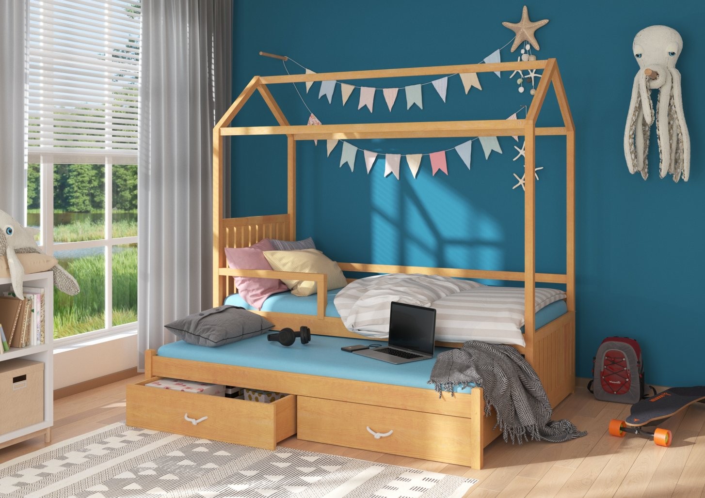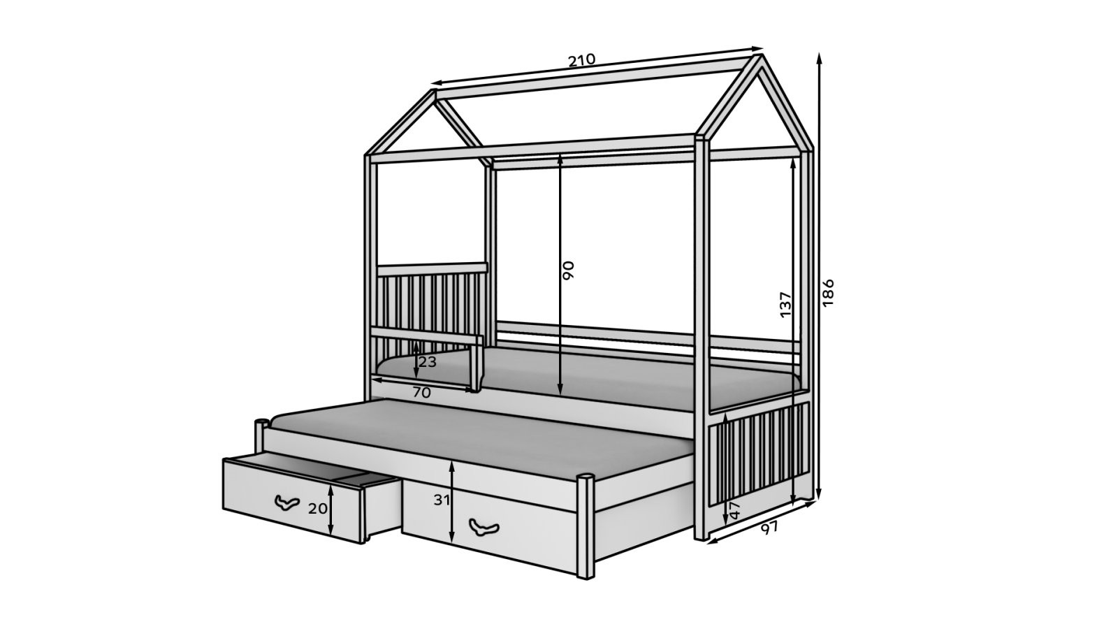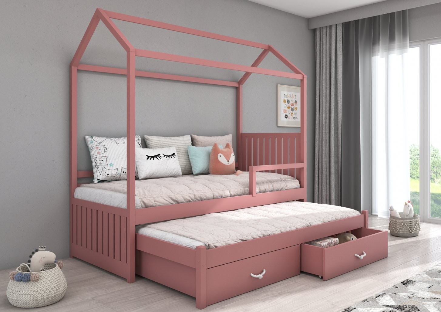 Otroška postelja hiška JONASZEK je čudovita izbira za vsako otroško sobo, saj s svojo edinstveno obliko v obliki hiške uresničuje sanje otrok. Namenjena je dvema osebama, idealna za souporabo dveh otrok ali občasne goste.
