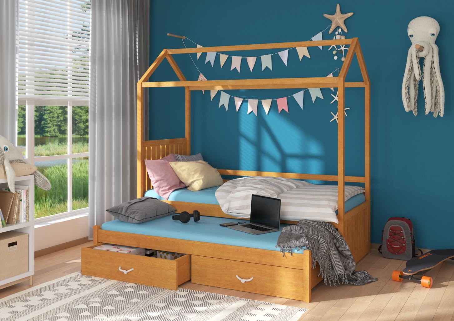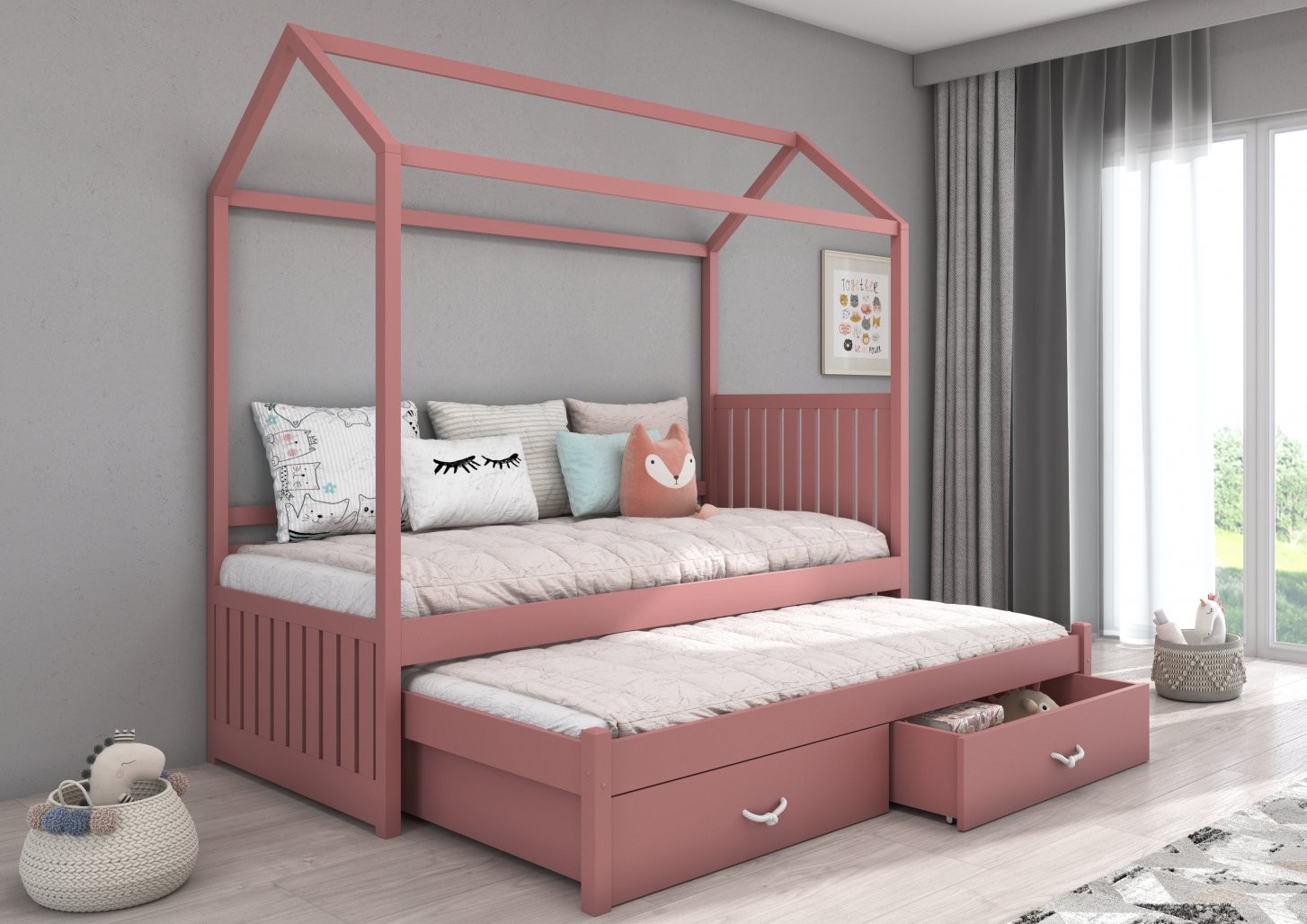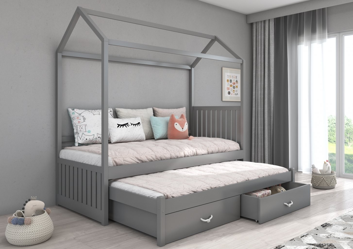 Otroška postelja JONASZEK v obliki prikupne hiške je popolna izbira za otroške sobe. Zasnovana je za dva otroka ali za goste, saj vključuje dodatno ležišče in dve prostorni predalnici za shranjevanje posteljnine.