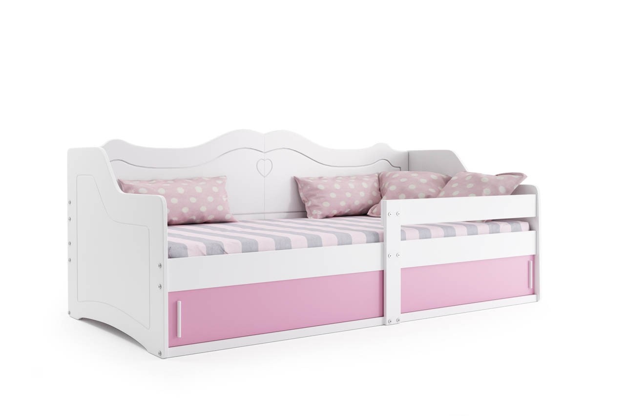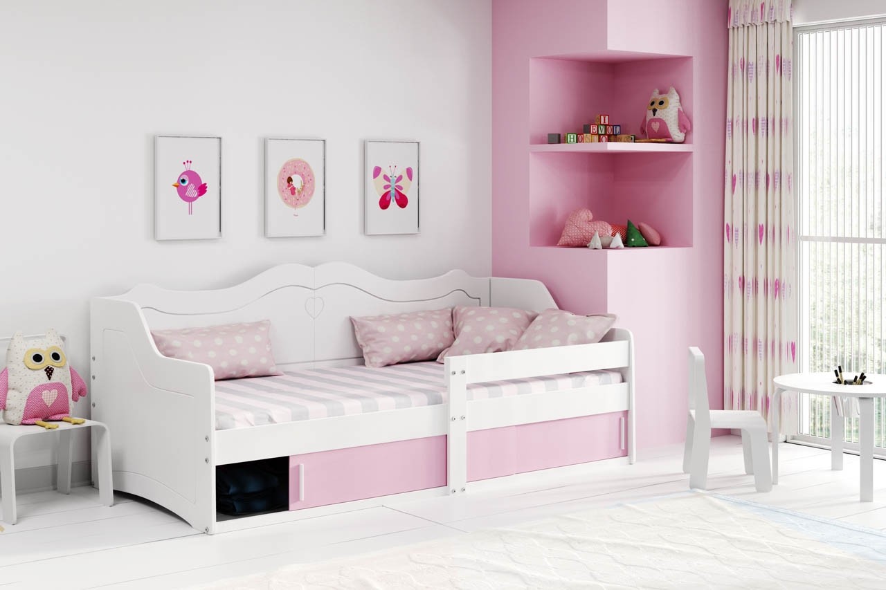Privoščite svojemu otroku kvalitetno in zanimivo posteljo JULIA, ki je na voljo v kombinaciji bele in roza barve. Postelja ima veliko shranjevalnega prostora, saj nudi drsna vrata pod posteljo, ki omogočajo čisto in urejeno sobo. Poleg tega, pa ima tudi zaščitno ograjico, ki poskrbi, da bo otrok varno spal, vi pa boste brez skrbi in si boste lahko privoščili miren spanec.