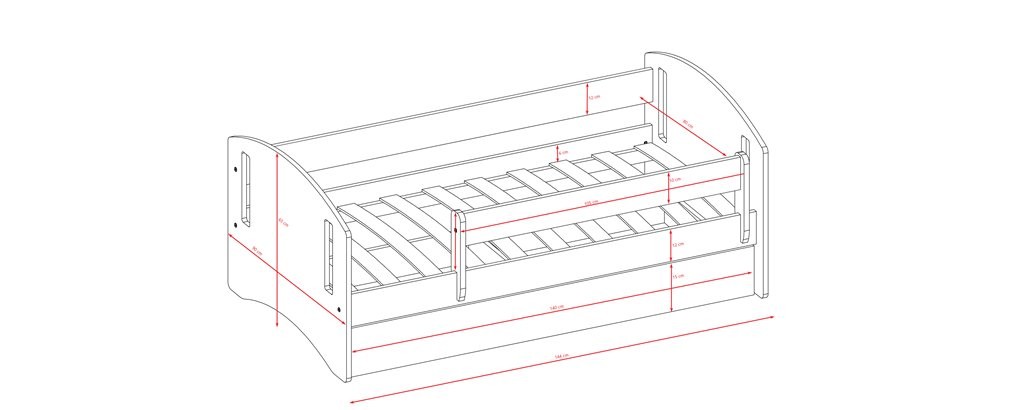 Postelja vključuje fleksibilni letveni pod, ki nudi ustrezno oporo ležišču, zaobljeni robovi pa povečajo varnost pri uporabi. Lahko izberete varianto s penastim ležiščem in predalom ali pa bolj minimalistično varianto brez tega. Zaradi več dimenzij je primerna za različne potrebe uporabnika.
