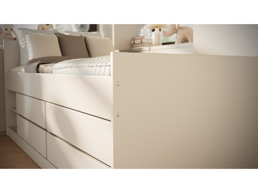 Postelja je zasnovana za sodobno otroško sobo, kjer sta pomembni preglednost in uporabnost. Opremljena je z 2 odprtima policama in 4 prostornimi predali, ki omogočajo pregledno shranjevanje posteljnine, oblačil, igrač ali drugih dodatkov. Konstrukcija omogoča optimalno kroženje zraka za udobnejše spanje, največja nosilnost znaša do 100 kg. Na voljo je model brez ležišča ali z ležiščem, priložena pa so tudi navodila za samostojno montažo.