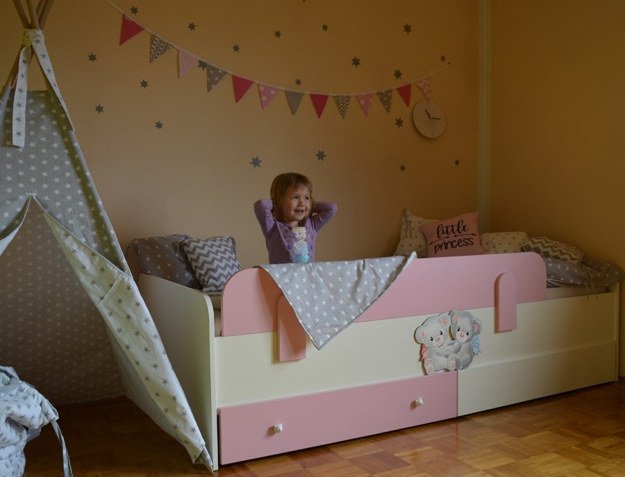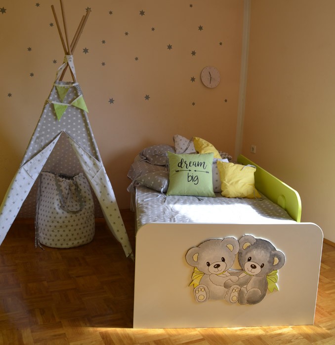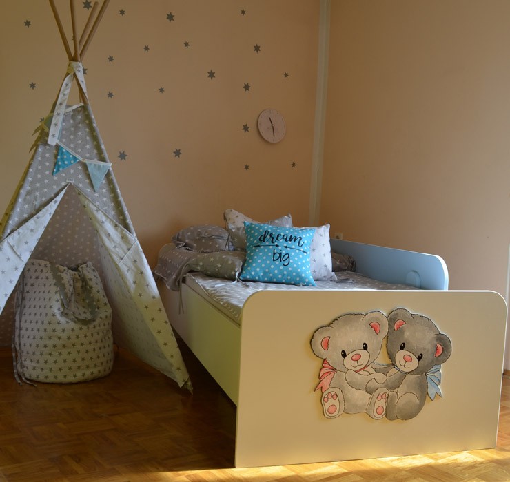 Otroška postelja Medvedek 2 je izjemno kompaktna in kvalitetna postelja, ki je primerna tako za vaše malčke, kot za najstnike. Na voljo je v dimenziji 90x200 cm v beli barvi in z univerzalnim motivom medvedkov, ki je ročno narisan in snemljiv. Postelja je izdelana iz iverne plošče, letvice pa so iz masivnega lesa. Z enim samim potegom snemljivo varovalo lahko pomikate po stranici postelje in s tem povečate varnost za vašega otroka. Varovalo je na voljo v bež, roza, modri ali zeleni barvi.