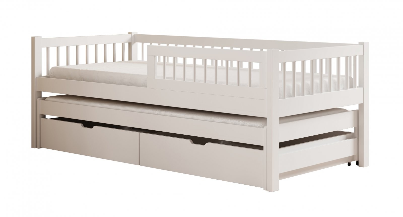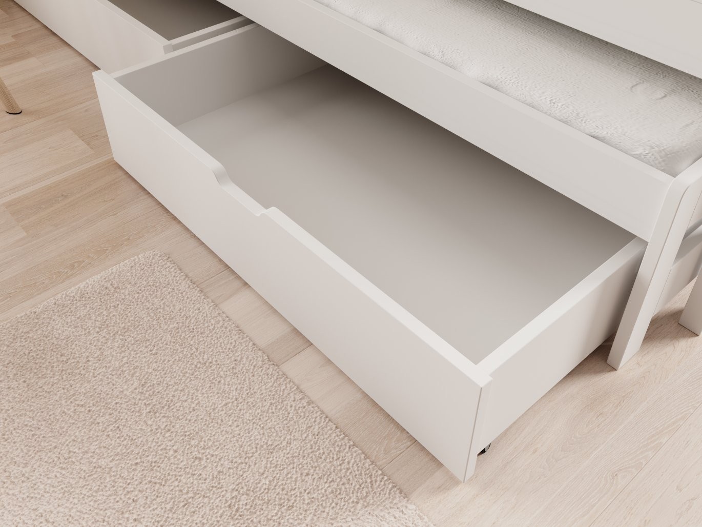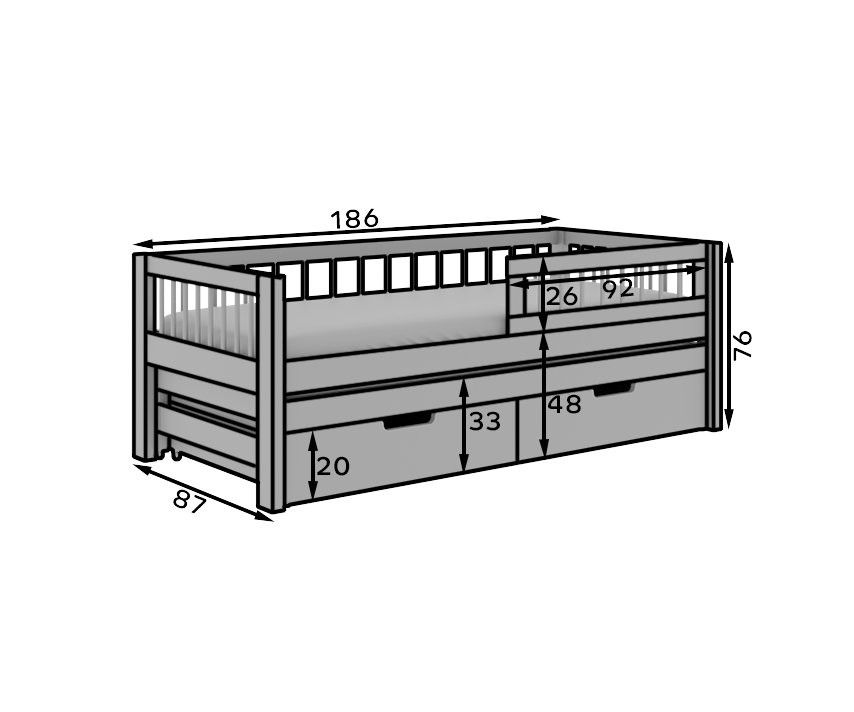 Otroška postelja Orio z ležiščem in predali je popolna izbira za otroke, ki potrebujejo več prostora ali si sobo delijo s sorojenci. Njena dvostranska zasnova omogoča prilagodljivost postavitve, hkrati pa ponuja udobje in praktičnost.