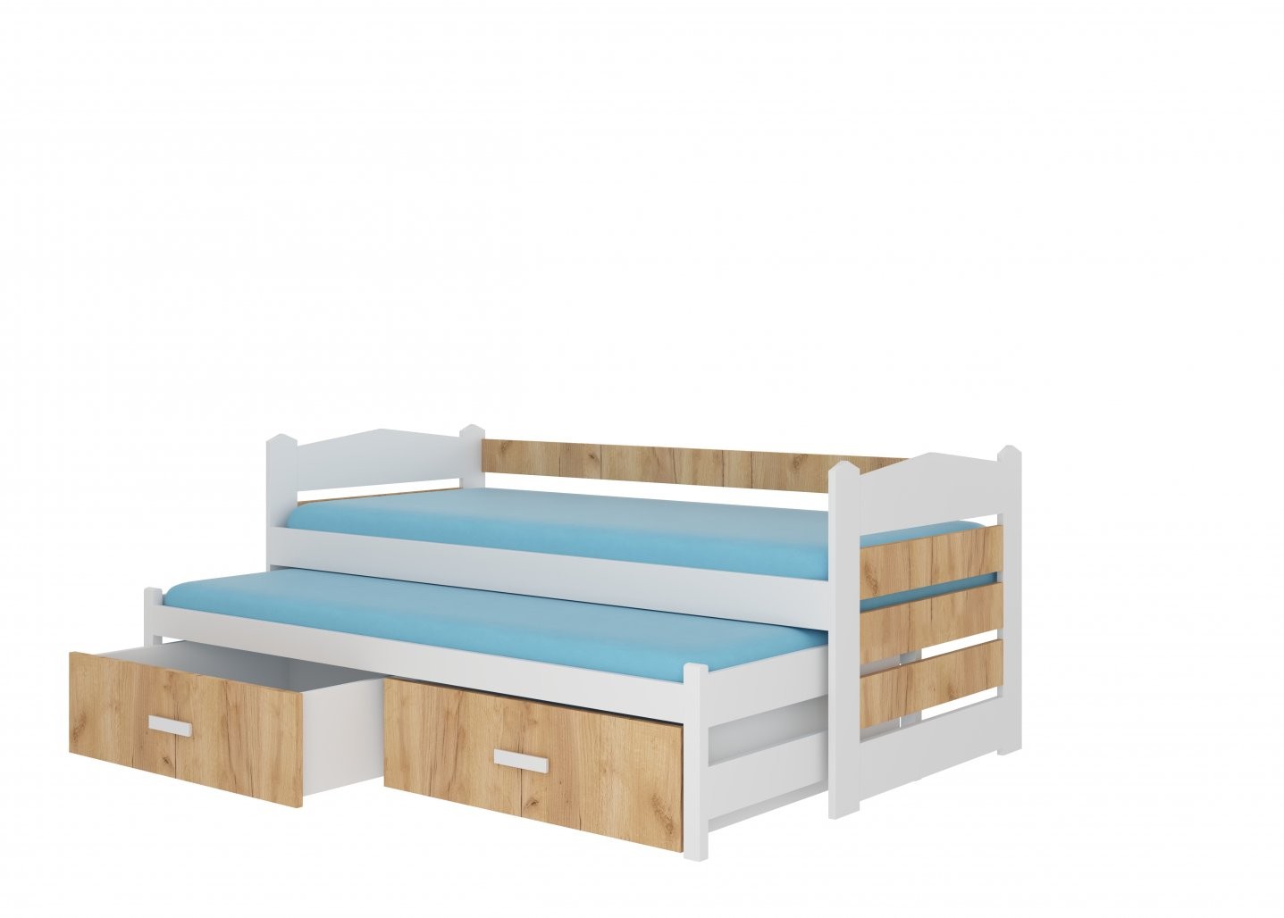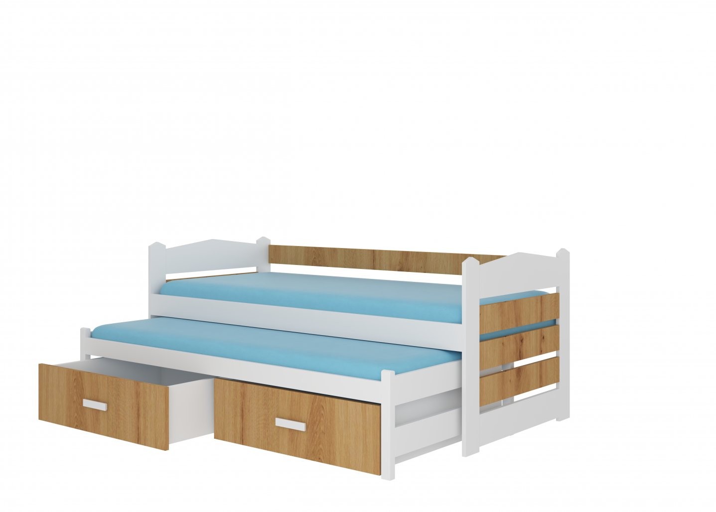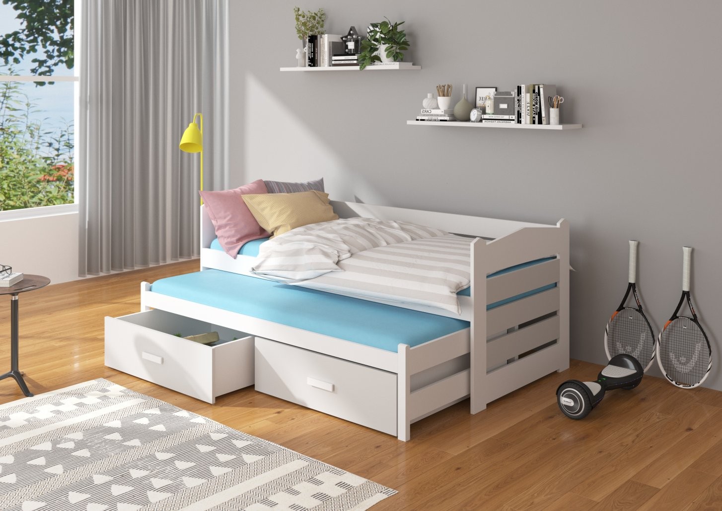 Postelja je izdelana iz kakovostnega borovega lesa in laminirane plošče, kar zagotavlja trdnost in stabilnost. Poleg tega vključuje dve praktični predalnici za shranjevanje posteljnine ter komplet udobnih penastih vzmetnic debeline 8 cm.