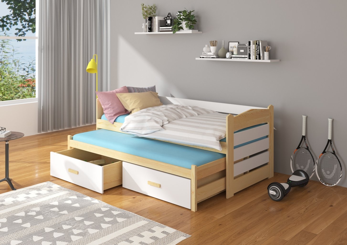 Postelja je izdelana iz kakovostnega borovega lesa in laminirane plošče, kar zagotavlja trdnost in stabilnost. Poleg tega vključuje dve praktični predalnici za shranjevanje posteljnine ter komplet udobnih penastih vzmetnic debeline 8 cm.