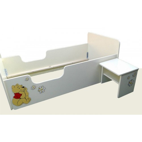 Otroška posteljica MEDVEDEK PU S TIGRČKOM (belo-modra) z letvenim dnom iz masivnega lesa je unikatna otroška postelja z motivom Medvedka Puja in prikupnega tigrčka. Otroška postelja je na voljo v različnih dimenzijah, narejena iz MDF plošče, barvane z barvami na vodni osnovi, ki so varne za otroke. Kot dodatek lahko naročite tudi varovalo, ki je prikazano na sliki.