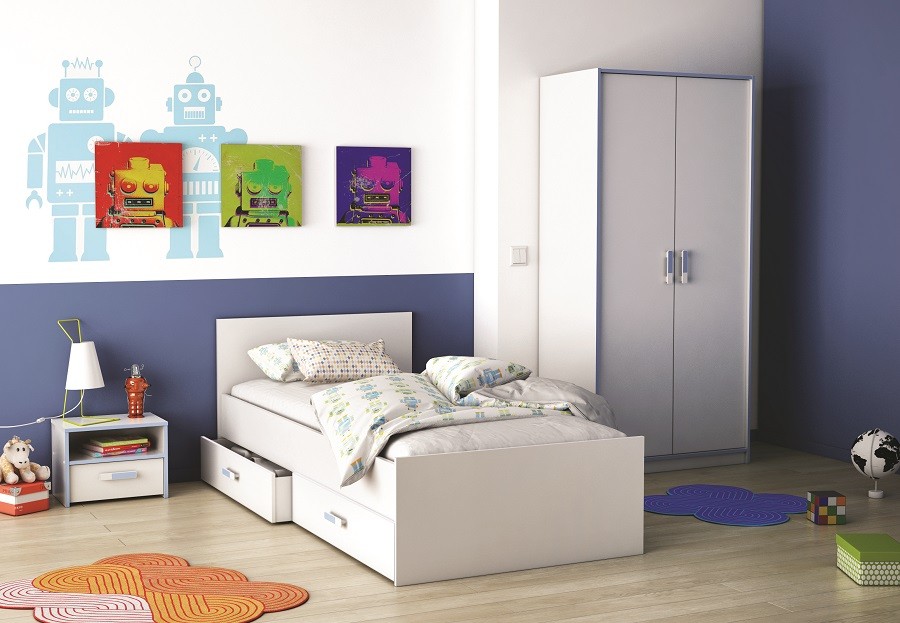 Otroška soba SWITCH vsebuje posteljo (primerna za vzmetnico 90x190 cm), predalnika (dodatek k postelji), pisalno mizo, nočno omarico in dve prostorni omari, ki bosta nudili več kot dovolj prostora za oblačila in druge dragocenosti vašega malčka.
