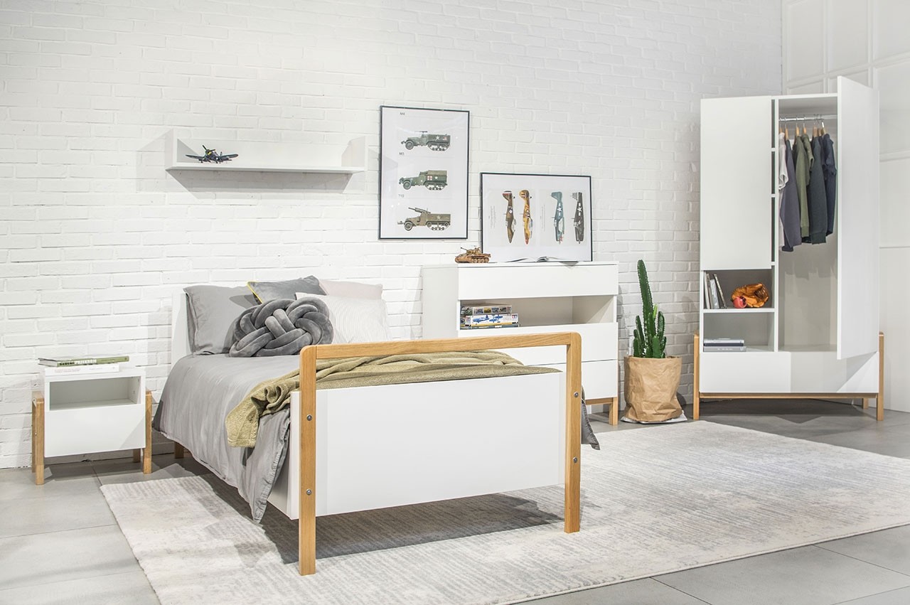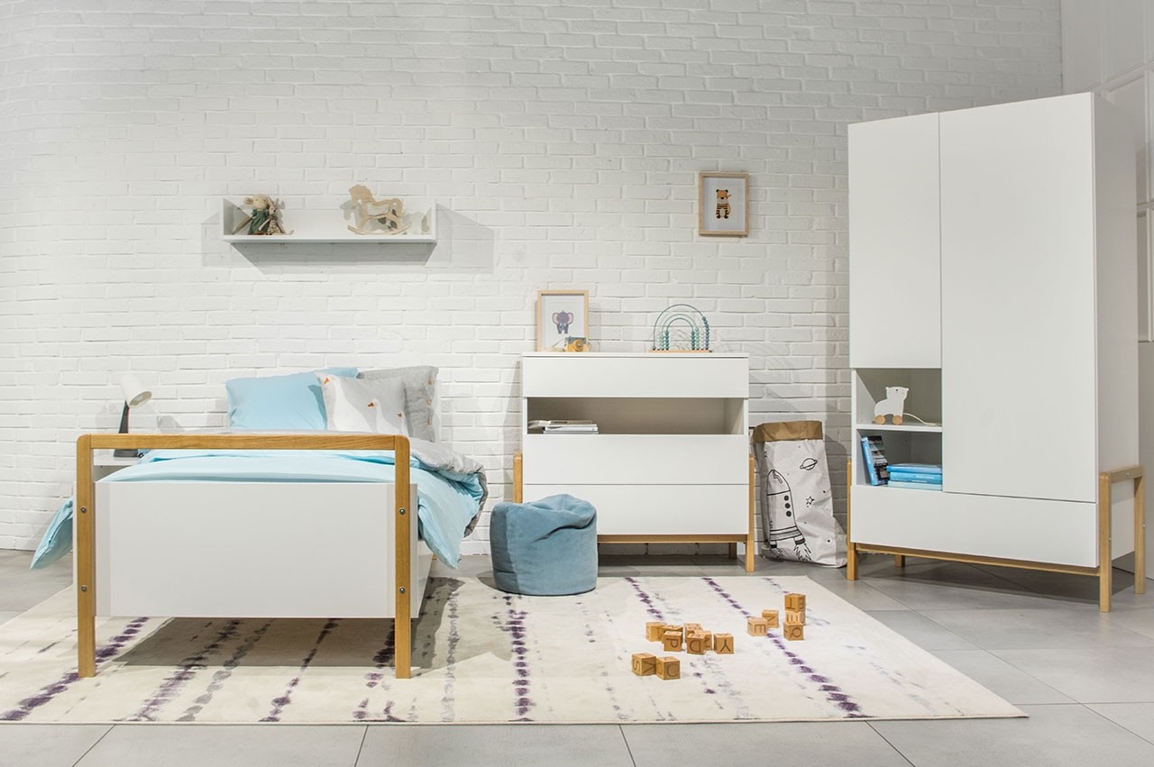 Otroška soba VIVAN se ponaša z modernim skandinavskim dizajnom, ki se lepo poda v vsako otroško sobico. Zaradi minimalističnega dizajna je otroška soba VIVAN primerna tako za otroške kot za mladinske sobe. V setu je vključena stenska polica, nočna omarica, komoda, postelja ter garderobna omara, tako da vsebuje vse kar otrok potrebuje.