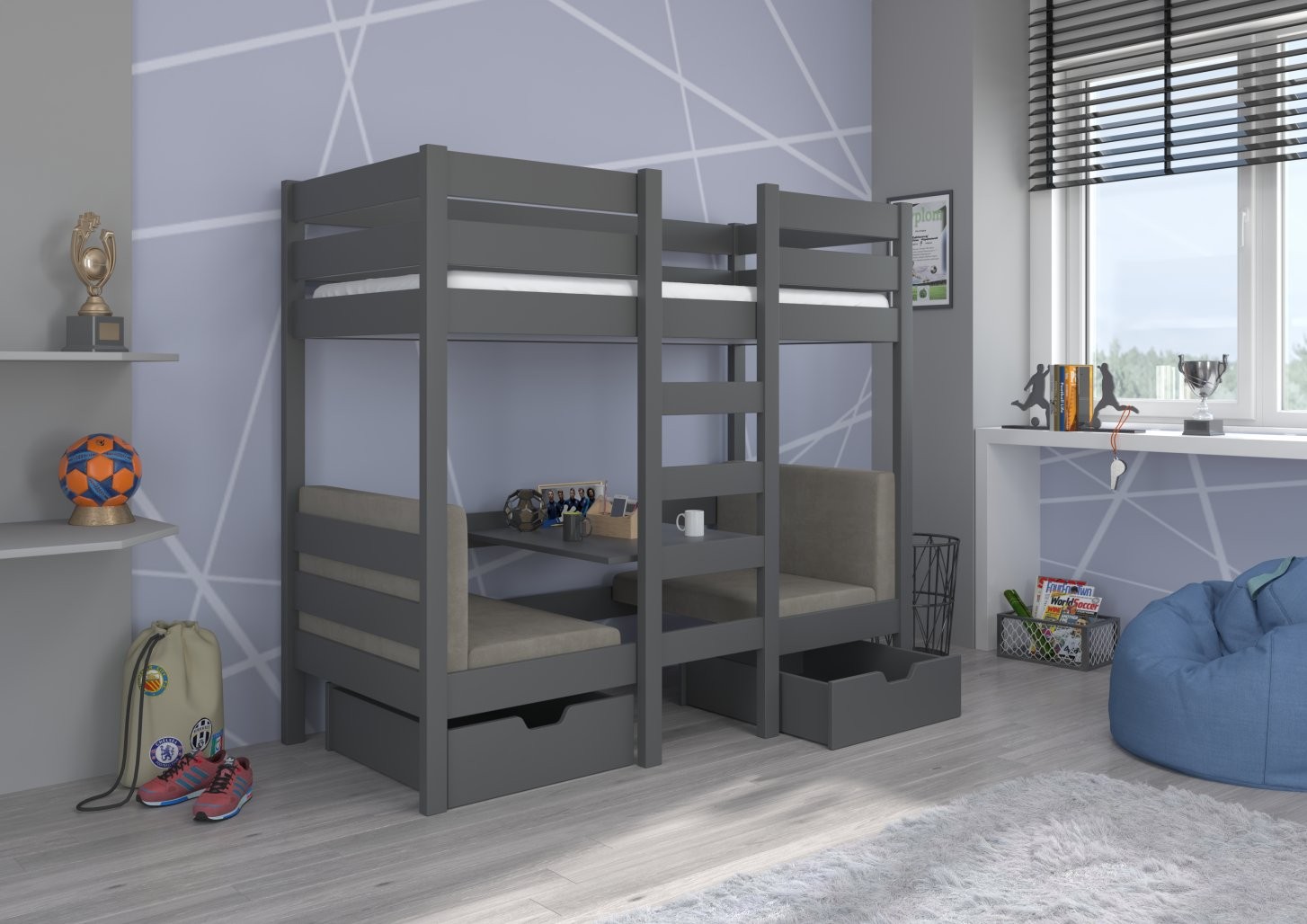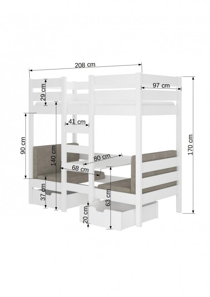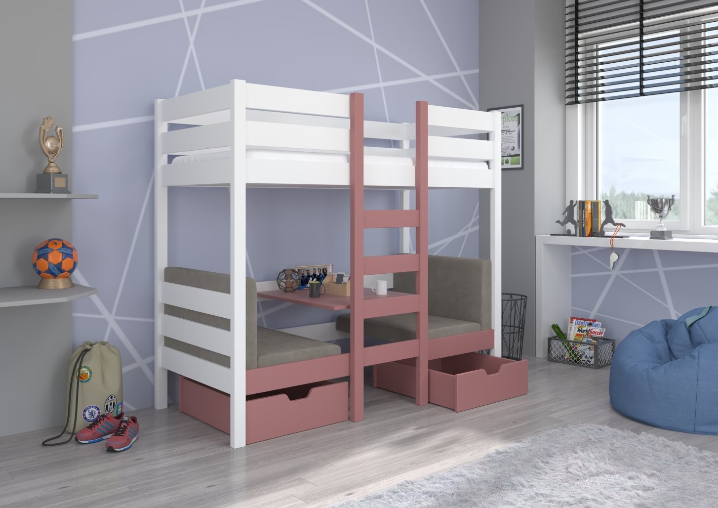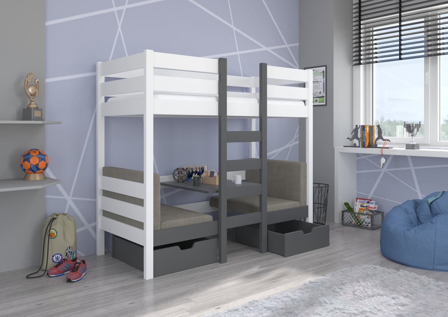 Otroški pograd BART z mizico in sedišči 200x90 je praktična in inovativna rešitev za majhne otroške sobe. Zasnovan je za maksimalno izrabo prostora in ponuja edinstveno kombinacijo spalnega in igralnega prostora.