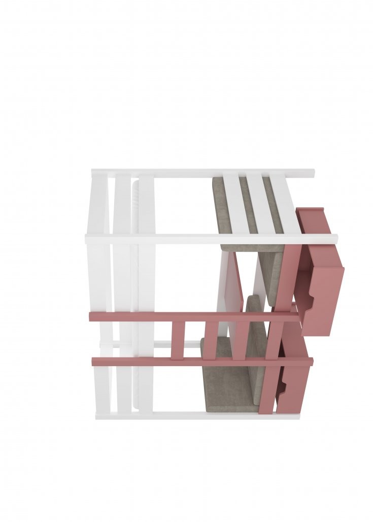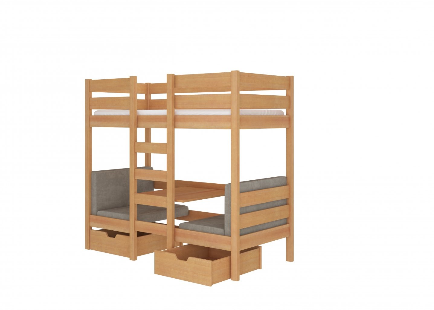 Ta večnamenska postelja vključuje zgornjo posteljo ter spodnji del, ki se lahko preoblikuje v mizico z dvema sediščema in naslonjali. Varnost je zagotovljena z ograjicama na obeh nivojih, vzpenjanje pa olajša stopničasta lestev.