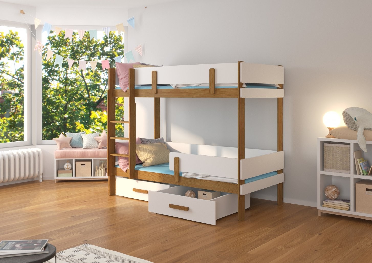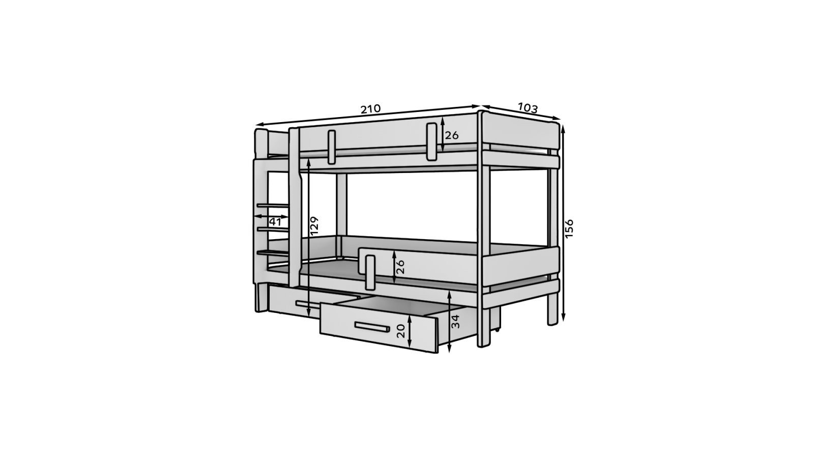 - Vključuje: Valjani leseni posteljni okvir, 2 prostorna predala za posteljnino, zaščitne ograjice na obeh nivojih, stopničasta lestev
