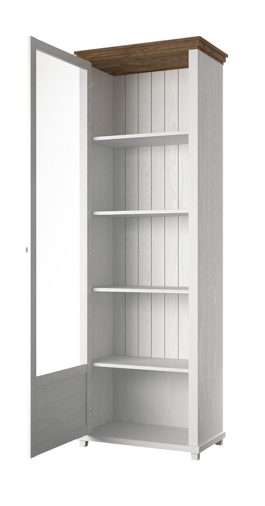 Ozka vitrina EVORA je na voljo v Abisko pepel in je rustikalnega stila, ki je primeren za vsako dnevno sobo. Vsebuje veliko shranjevalnega prostora kamor lahko shranite vaše kozarce, krožnike in ostale stvari, ki želite, da so vidne v dnevni sobi.