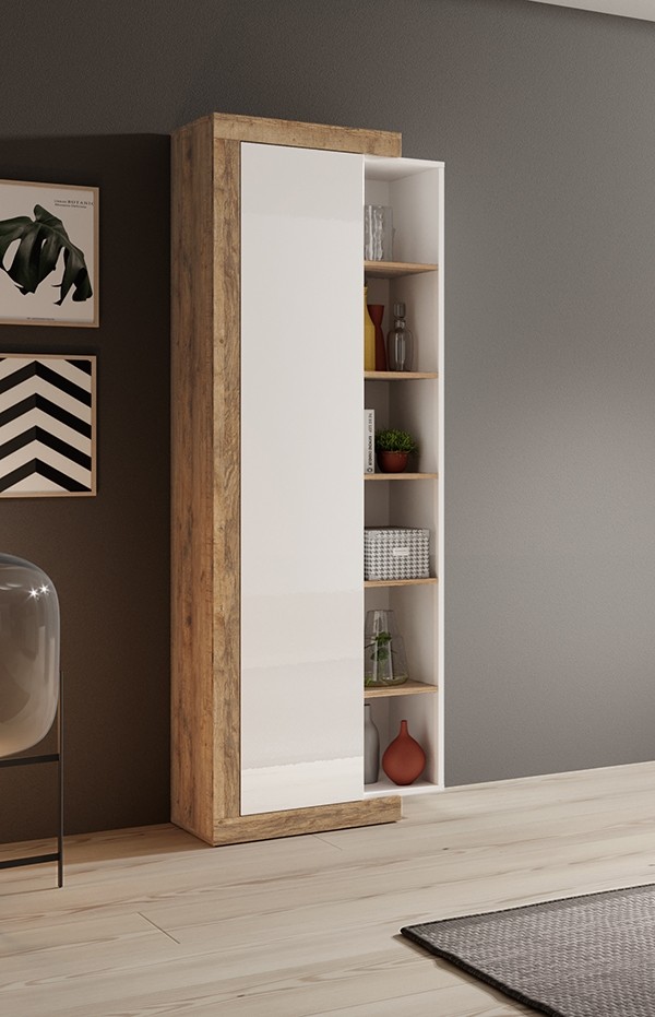 Ozka vitrina SINTRA je elegantna in moderna vitrina, ki bo pristajala v vsako dnevno sobo. Vsebuje veliko shranjevalnega in odlagalnega prostora za vaše kozarce, krožnike in ostale stvari, ki jih želite imeti na vidnem mestu. Na voljo je v kombinaciji hrast Samdal in bele barve v visokem sijaju.
