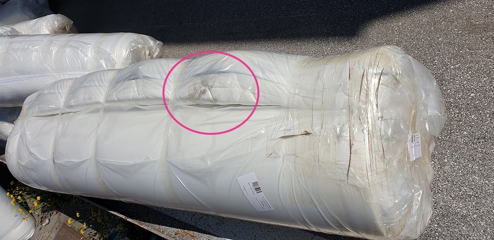 Ležišče je novo in original zapakirano. zaradi transporta se je folija raztrgala in posledično je ležišče malo umazano. Slika umazanije v galeriji. Prevleka je snemljiva in pralna in jo je možno v stroju dodatno očistiti.