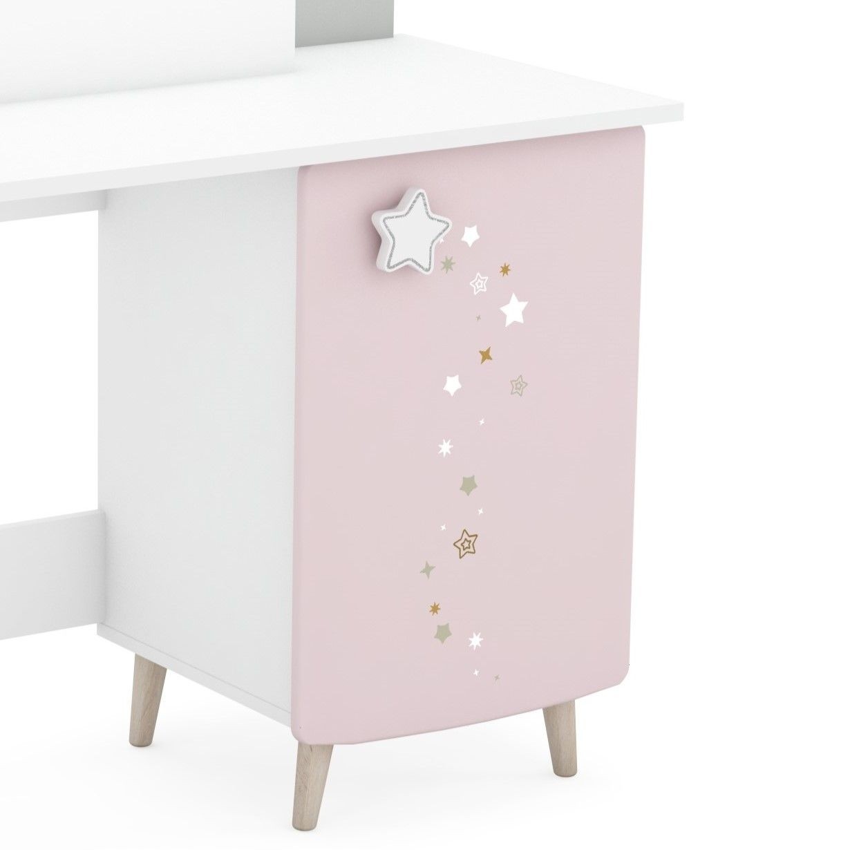 Pisalna miza BELLA je primerna za otroško sobo. Miza je v kombinaciji bele, roza in sive barve. Narejena je iz MDF materiala in iverala, debeline 15 mm in 18 mm (plošča mize). Na desni strani ima omarico z 1 polico v notranjosti, nastavljiva je na 2 višine. Polica je dimenzije 36,8x36,8 cm. Na ročaju vrat je dekorativna zvezda z srebernimi bleščicami. Pisalna miza stoji na štirih lesenih nogicah v natur barvi. Na mizi je še dodaten manjši predal velikosti 60x14,5x10 cm. Oglejte si še ostale artikle iz istega programa.