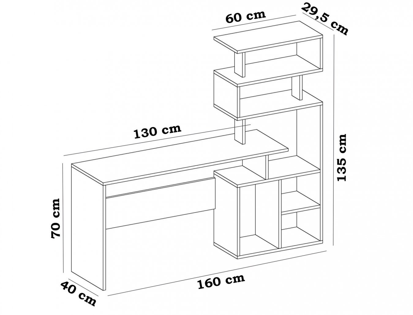 Naša študijska miza s 130 cm širine, 70 cm višine in 40 cm globine ponuja dovolj prostora za vaše knjige, prenosni računalnik in drugo študijsko gradivo. Omarica, ki meri 60 cm v širino, 135 cm v višino in 29. 5 cm v globino, zagotavlja dodatno shrambo za vaše stvari. Številne police vam omogočajo, da imate vse lepo urejeno, in zagotavljajo enostaven dostop do najpomembnejših stvari.